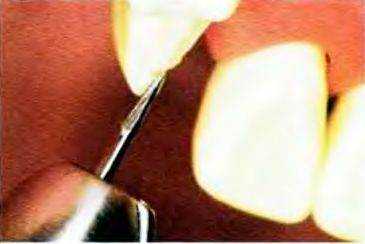 Рис. 7-33. При необходимости лишь минимального выхода границ препарирования на вестибулярную поверхность в проксимальных областях (чаще всего в области резцов) срез формируют острозаточенным эмалевым долотом или эмалевым ножом шириной 1,5-2,0 мм Во фронтальном сегменте зубной дуги с эстетической точки зрения дистальная поверхность клыка наименее значима.