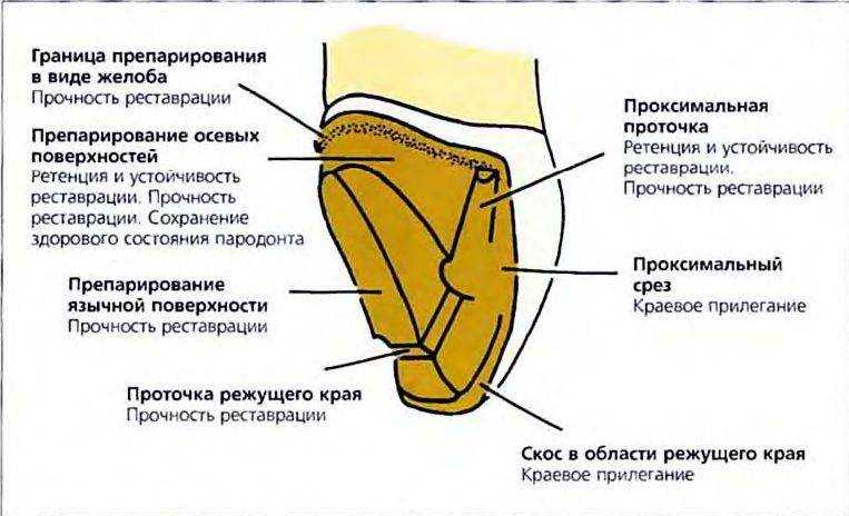 Более вестибулярное препарирование проточек позволяет максимально увеличить их длину, " а также улучшить краевое прилегание, поскольку обеспечивает рядом с острым краем реставрации достаточный объем металла.