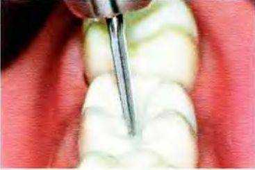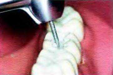 Рис. 11-37. Препарирование начинают в центральной фиссуре, погружая бор № 170 на глубину около 1,5 мм. Наконечник наклоняют медиально или дистально, поскольку край кончика бора удаляет твердые ткани значительно эффективнее, чем плоский торец.