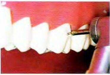 Рис. 11-73. Первый канал препарируют, удерживая сверло перпендикулярно щечной поверхности зуба. Для вкладок V класса глубина канала должна составлять от 1,5 до 3,0 мм.`"` По аналогии с другими реставрациями с ретенционными парапульпарными штифтами, чем длиннее штифт, тем выше ретенция реставрации