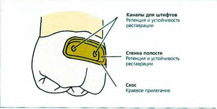Внутрикоронковые реставрации оказывают расклинивающее действие на твердые ткани зуба. Расклинивающие силы, направленные из центра зуба кнаружи, больше всего выражены во время примерки и фиксации реставрации, однако они возникают каждый раз, когда на зуб действует жевательная нагрузка.` Для успешного функционирования реставрация должна опираться на достаточный объем здорового дентина, или в ее конструкции должны быть элементы, перераспределяющие окклюзионную нагрузку во избежание разрушения ослабленных твердых тканей.