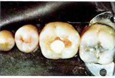Рис. 11-84. Первый моляр нижней челюсти препарирован под вкладку I класса На дне полос ти в проекции центральной фиссуры видна це ментная основа