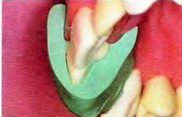 Рис. 13-3. Силиконовый шаблон можно разрезать в поперечном направлении через середину коронки препарируемого зуба Это позволяет оценить объем иссечения твердых тканей в целом. в том числе на режущем крае и с язычной стороны. Однако такой шаблон не дает никакой информации о степени препарирования в медиодистальной плоскости. Каждый стоматолог решает для себя сам. какой тип силиконового шаблона оптимален в конкретной ситуации. При наличии времени целесообразно изготовить сразу два силиконовых шаблона.