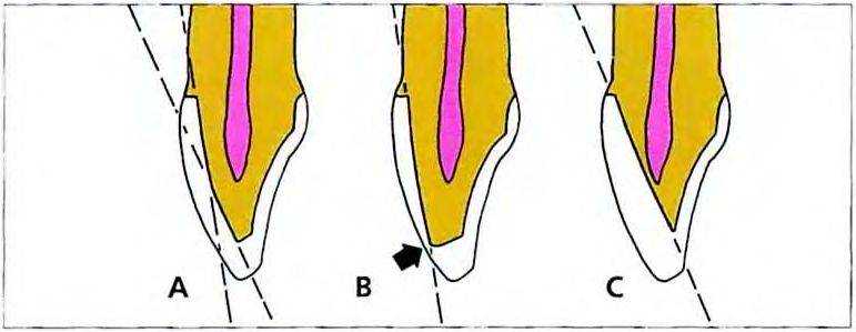 " Одна плоскость должна быть практически параллельна пути введения реставрации, а другая - режущей и средней третям исходной вестибулярной поверхности (А). Одна из наиболее распространенных ошибок заключается в препарировании зуба только в одной плоскости, параллельной пути введения реставрации, что приводит к созданию недостаточного пространства для керамики в области режущего края коронки (В) При чрезмерном препарировании зуба в одной плоскости тоже можно обеспечить достаточное пространство для реставрации в придесневой части и в области режущего края, однако при этом возникает риск повреждения пульпы в средней трети зуба, а также создается чрезмерно конусная культя (С)
