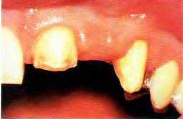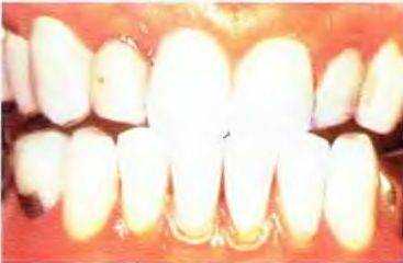 Рис. 13-5. В данном случае препарирование проводили не в двух плоскостях, а в одной, поэтому слой керамики на вестибулярной поверхности коронки очень тонкий На левом центральном резце виден неэстетичный контур опакового фарфора, соответствующий режущему краю культи (Снимок предоставлен д-ром Royce A Hatch, Денвер. США)