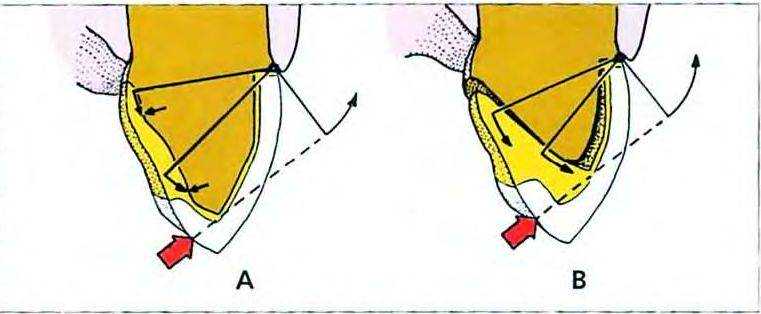 Рис. 13-;>5. Язычную поверхность переднего зуба следует препарировать так, чтобы сохранить вертикалью ю стенку небного бугорка и вогнутую поверхность над ним (А). Такая форма культи создает зоны эетенции в виде ступенек, противостоящих воздействующим на язычную поверхность опрокидывающим силам. Вогнутость на язычной поверхности позволяет изготовить коронку правильной фо( мы с сохранением правильного окклюзионного положения при минимальном иссечении твердых тканей. Если язычная поверхность препарирована в виде одной наклонной плоскости (В), то дуги «ращения во всех точках коронки будут или параллельны поверхности зуба, или направлены в стсоону от нее В таком случае малая устойчивость коронки может подвергаться расцементированию