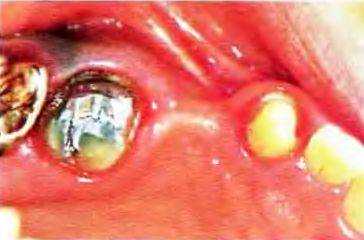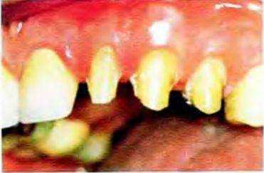 Рис 13-43. Вид готового металлокерамического мосговидного протеза после цементирования. Придесневая граница препарирования на вестибулярной поверхности клыка расположена немного апикальнее края десны. Такое положение края реставрации приводит к минимальному раздражению мягких тканей, поэтому коронка не станет ятрогенным предрасполагающим фактором для развития заболеваний пародонта. При отказе от использования в области клыка керамического края реставрации, по косметическим соображениям, край коронки следует погрузить в зубодесневую бороздку несколько глубже
