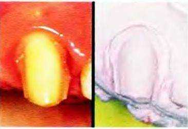 Рис 13-42. вестибулярный вид того же клыка (слева) На фотографии справа продемонстрирована гипсовая модель. Поскольку во время автомобильной аварии клык практически не пострадал, то провели классическое препарирование зуба с созданием двух проксимальных «крыльев» На вестибулярной поверхности придесневая граница препарирования представляет собой прямой уступ без скоса несколько шире 1.0 мм.