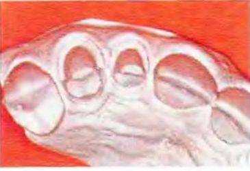 Рис. 13-51. Язычный вид того же зуба На дистальной поверхности резца препарирована коробчатая полость для размещения шарнирного фиксирующего элемента. Боковой резец препарирован под стандартную металлокерамическую коронку. Клык препарирован для опорной накладки с адгезивной фиксацией