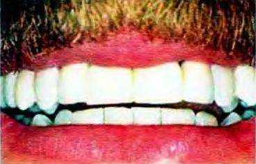 Рис 13-49. Фиксированные металлокерамические реставрации. Цельнокерэмический край коронок лишь незначительно погружен в зубодесневую бороздку, что позволяет получить хороший косметический результат