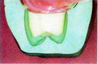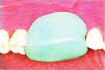 Рис. 14-38. Данный силиконовый шаблон подтверждает равномерность препарирования щечной поверхности зуба в осевом направлении Окклюзионный зазор в области щечного бугорка незначительно больше, чем в области язычного, поскольку щечный бугорок реставрации будет иметь керамическую облицовку Меньшая степень препарирования язычной осевой поверхности также указывает на то, что в этой области стенка реставрации будет только металлической