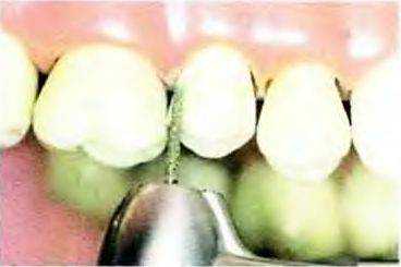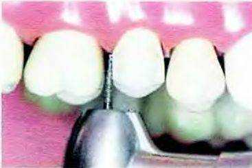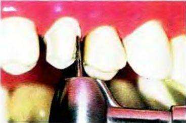 Рис. 14-20. Проксимальные поверхности начинают препарировать коротким копьевидным алмазным бором, тонкий кончик которого позволяет избежать повреждения соседних зубов.