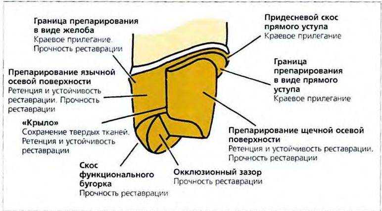 Рис. 14-39. Функциональные элементы культи жевательного зуба, препарированного под металлокерамическую коронку, и их значение