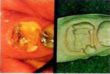Рис. 1б-29Ь. Зуб препарирован под накладку В области дистальной и язычной осевых стенок создана большая коробчатая полость, захватывающая дистальный язычный угол зуба, на медиальной поверхности создана стандартная коробчатая полость, в области угпов ретенционных полостей препарированы проточки. Вид во рту (слева) и на гипсовой модели (справа)