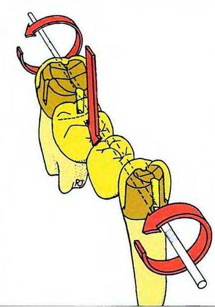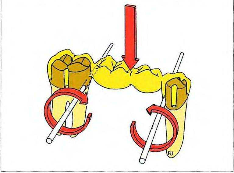 Рис. 17-1. Наиболее оптимальные участки для создания антиротационных бороздок расположены в плоскости, перпендикулярной оси вращения. Нагрузка на мостовидный протез с длинной прямой промежуточной частью вызывает вращающий момент вокруг щечно-язычных осей. Щечные и язычные проточки придают реставрации большую устойчивость