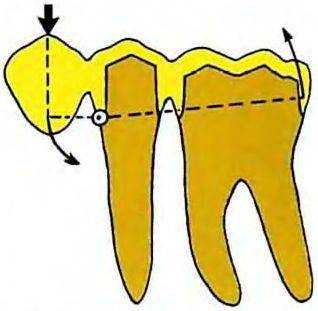 Рис. 17-4. Нагрузка на консольную часть мостовидного протеза приводит к оказанию рычаговой нагрузки на дистальную коронку. Устойчивость реставрации можно повысить с помощью дополнительных проточек с щечной и язычной сторон, а также с помощью придания параллельности осевым стенкам культи наиболее дистальной относительно дефекта и самой близкой к нему. Ближайшая к дефекту осевая стенка должна быть максимально высокой, чтобы ось вращения конструкции сместилась апикально, одновременно увеличивая угол приложения рычаговой нагрузки в области наиболее отдаленной осевой стенки культи