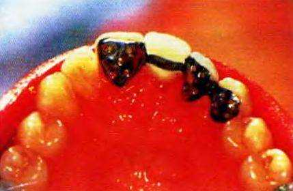 Рис. 17-9. Композитная смола выступает через маленькие отверстия в металлическом каркасе. Методика была предложена Rochette для адгезивной фиксации мостовидных протезов"