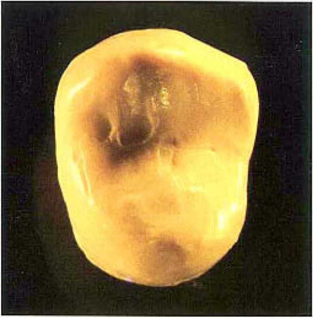 Рис. 3. Зуб повернут на 180", так как сначала обрабатывается небная половина. Щечная сторона зуба сейчас находится внизу снимка. |