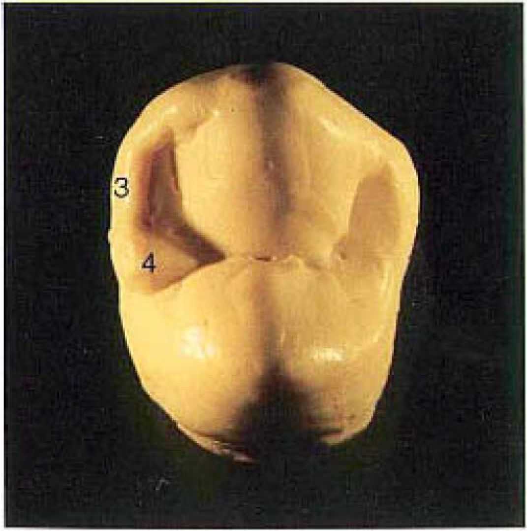 Рис. 4. Моделирование продолжается в щечной области зуба, поэтому модель на рисунке показана в прежнем положении. Оформляется дистальный краевой выступ зуба (3), доходящий до середины аппроксимальной области. Он несколько ниже, чем основной выступ и его следует продлить в форме язычка (4) до ди-стальной ямки.