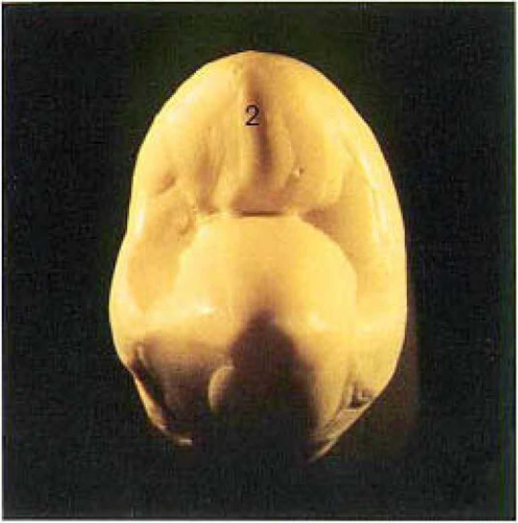 Центральный выступ (2) небного бугра должен быть оформлен на этой стадии работы, так как затем через него моделируется ап-проксимальный краевой выступ зуба. Моделирование осуществляется также, как при формирование щечного выступа, с той разницей, что центральный выступ (2) спускается к верхушке бугра сравнительно резко. Он плоский, за исключением характерно отделанного гребня. Верхушка бугра должна "смотреть" в мезиальную сторону.