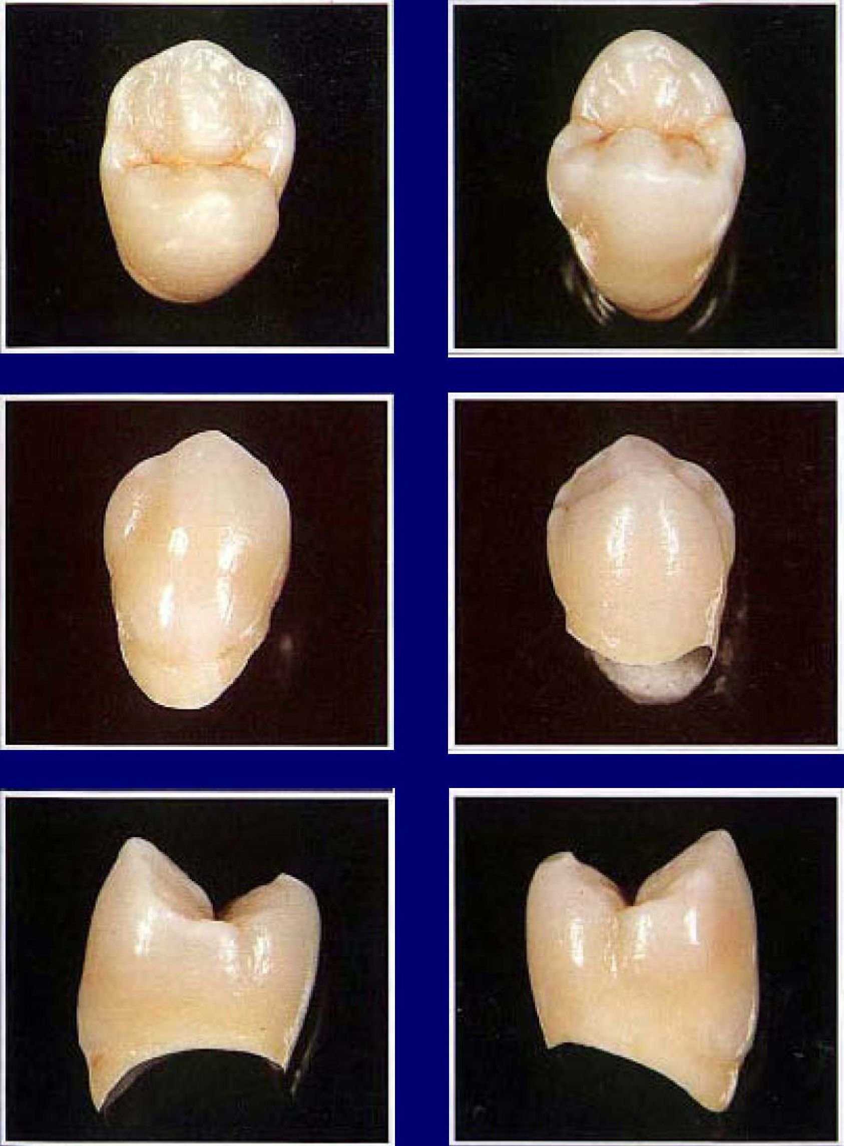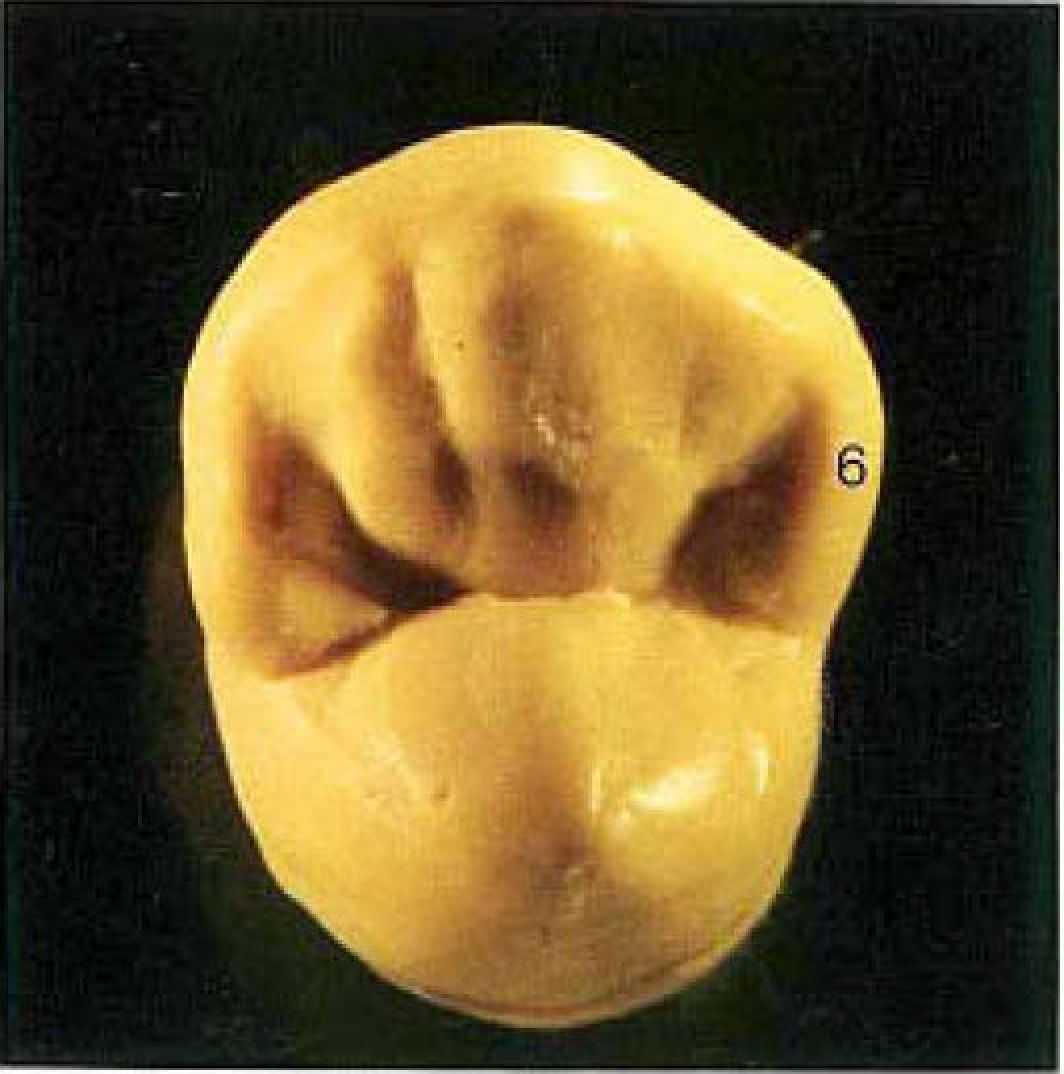 Рис. б. Теперь подлежит обработке мезиальный участок зуба: она аналогична дистальной зоне. Вначале необходимо наметить краевой выступ, моделируемый до аппроксимальной зоны. Здесь он переходит в .язычок (б), доходящий до центральной ямки.