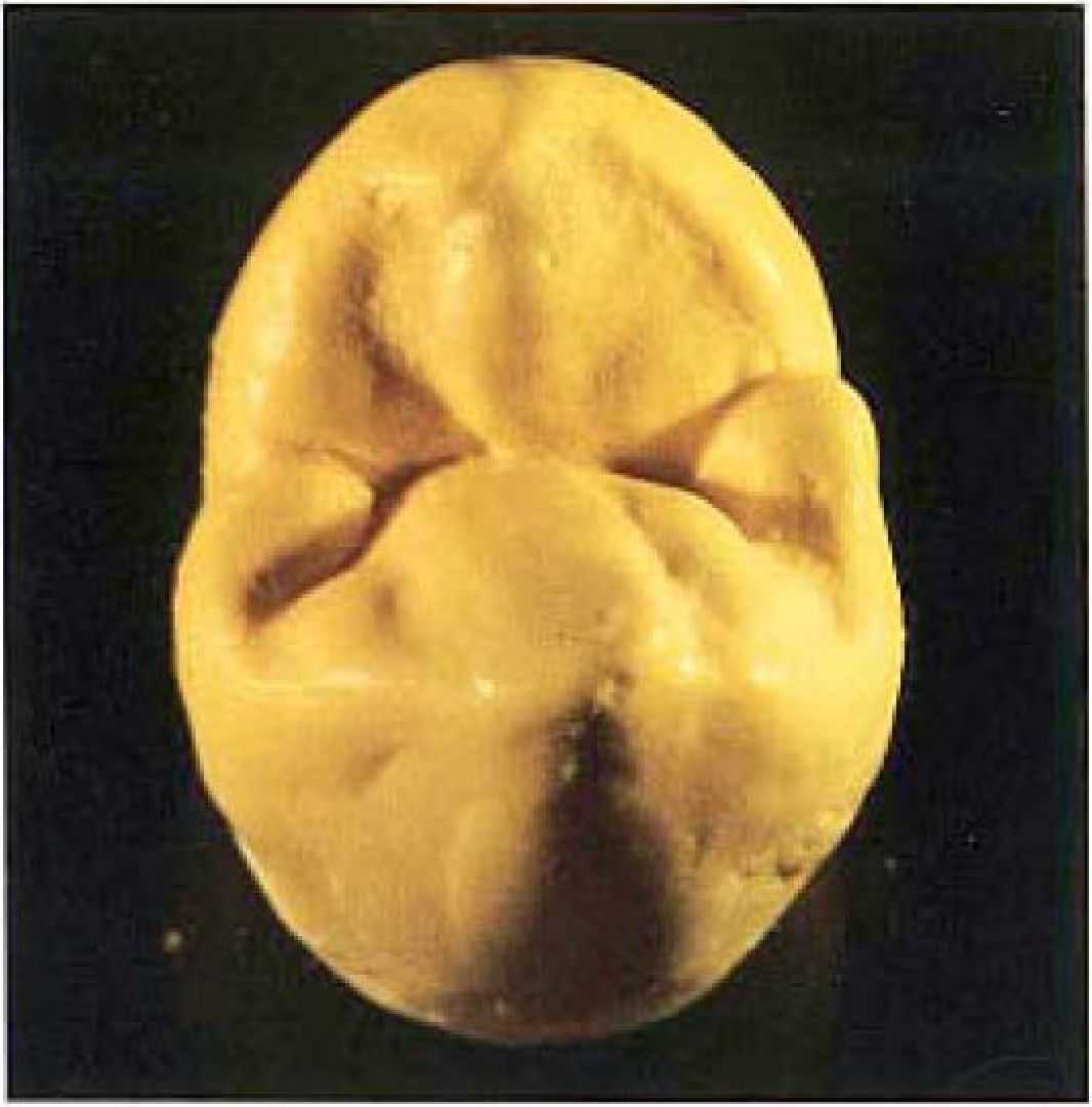 Рис. 1. Исходная ситуация для моделирования жевательной поверхности искусственного зуба. Внешние контуры зуба оформлены. Отсутствуют бугры и фиссуры. В случае. если жевательная поверхность должна моделироваться из керамики (что без упражнений с воском может быть рекомендовано лишь опытному зубному технику), то моделирование в окклюзнойной области на ранних этапах осуществляется лишь дентин-массой. Для моделирования жевательной поверхности сейчас применяется шмельцмасса. При описании иллюстраций исходим из того, что работа осуществляется в воске.