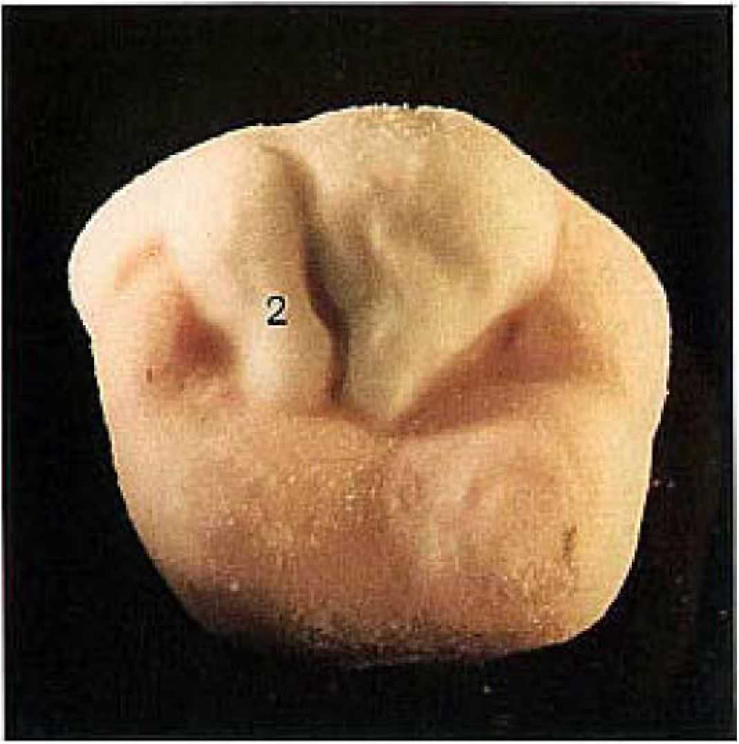 | Рис. 3. Затем оформляется мезиальный щечный бугор. Для этого сначала намечают диета льный щечный дополнительный бугорок (2).