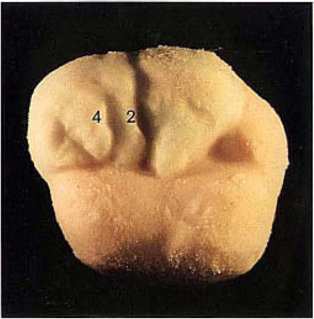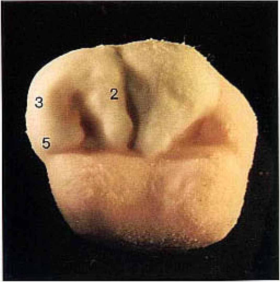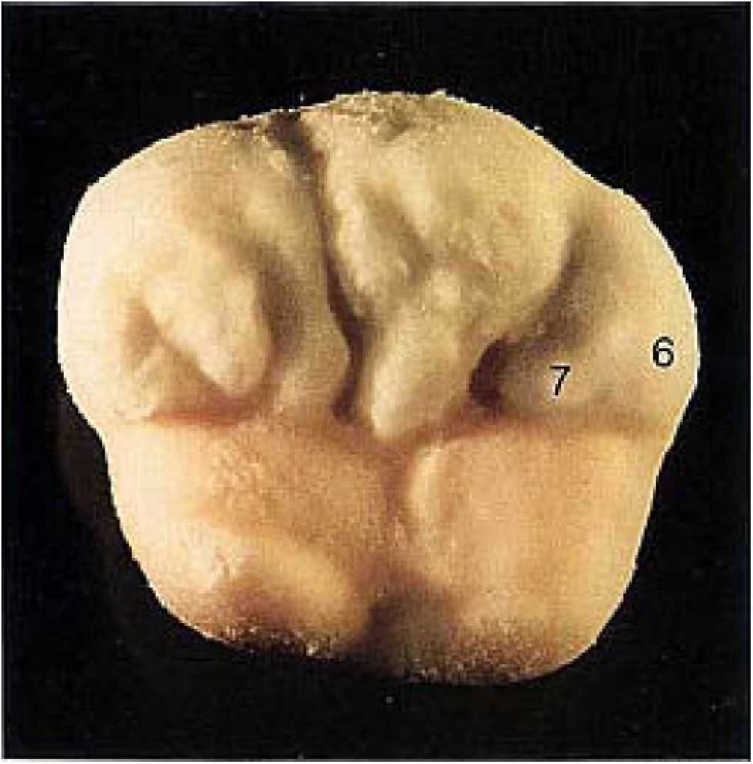 Он начинается на щечном конце дистального дополнительного бугорка (2) и доходит до аппроксимальной области, где удлиняется с помощью язычка (5). направленного к мезиальной ямке. |