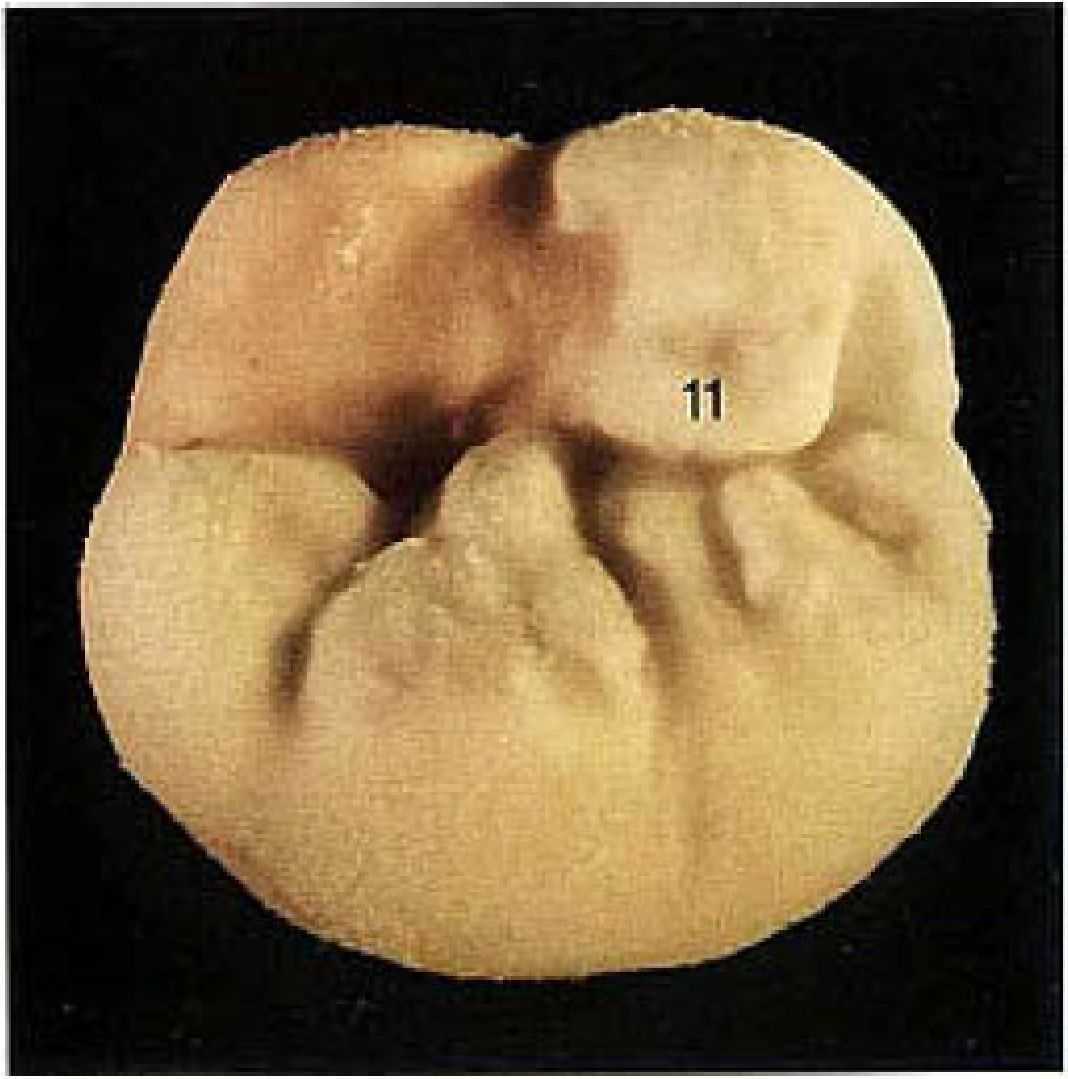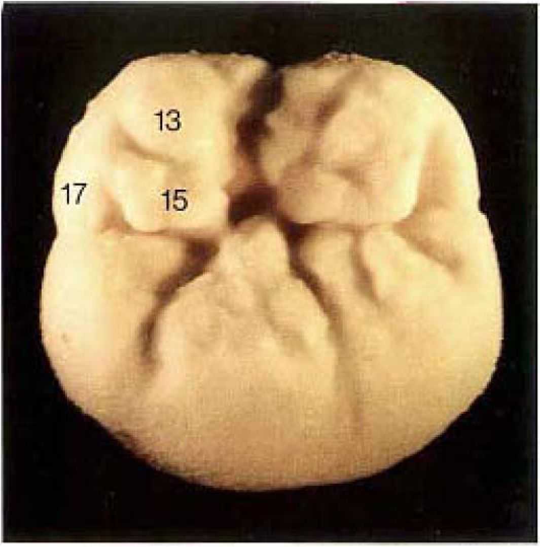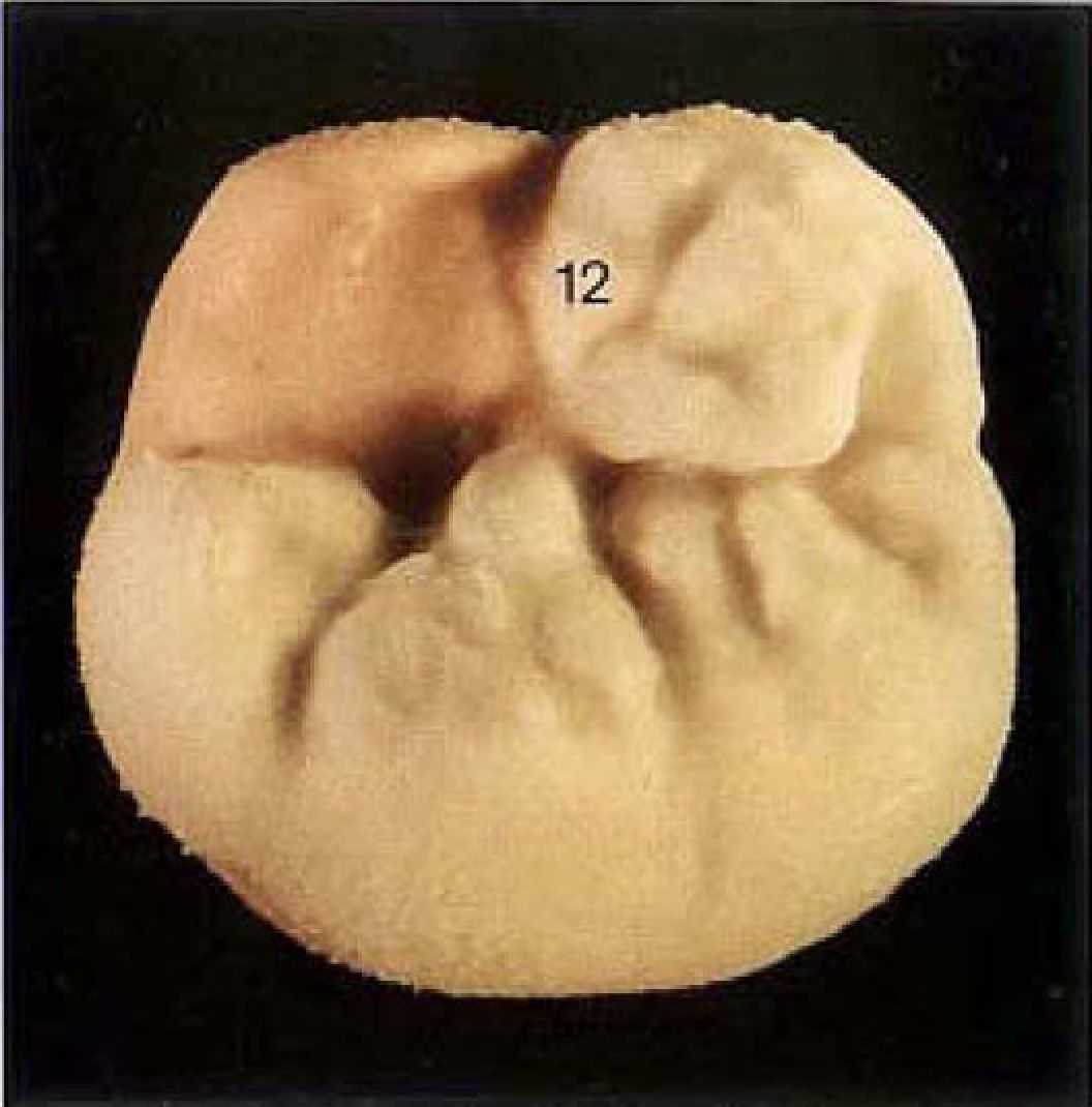 Рис. 9. Мезиальный язычный бугор дополняется бугорком (12). который начинается у краевой кромки бугра и изогнутой формой направляется к центральной ямке.