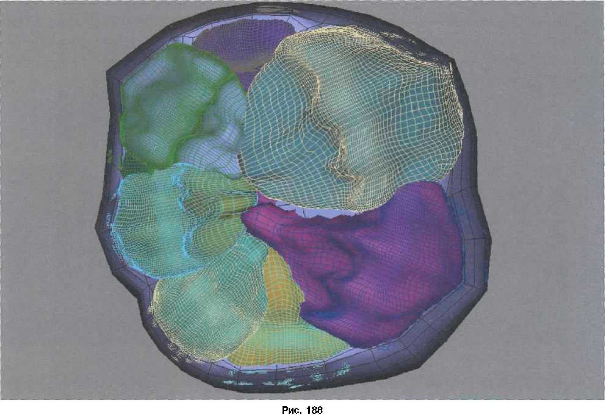 Соблюдение основных пропорций, грамотное расположение одонтомеров по поверхности, гармоничное их сочетание приводит к образованию новой композиции в виде первого моляра нижней челюсти. Рис. 188 отображает процесс формообразования первого моляра, который состоит из 8 одонтомеров (клыков) разного цвета (вид сверху). Можно себе представить, какое многообразие поверхностей существует, если преобразовывать данную величину, исполнять при этом определенные последовательности в моделировании. Образуется огромное количество геометрических форм, которые определенным образом сочетаются друг с другом, находясь в гармонии и выполняя соответствующие функции.