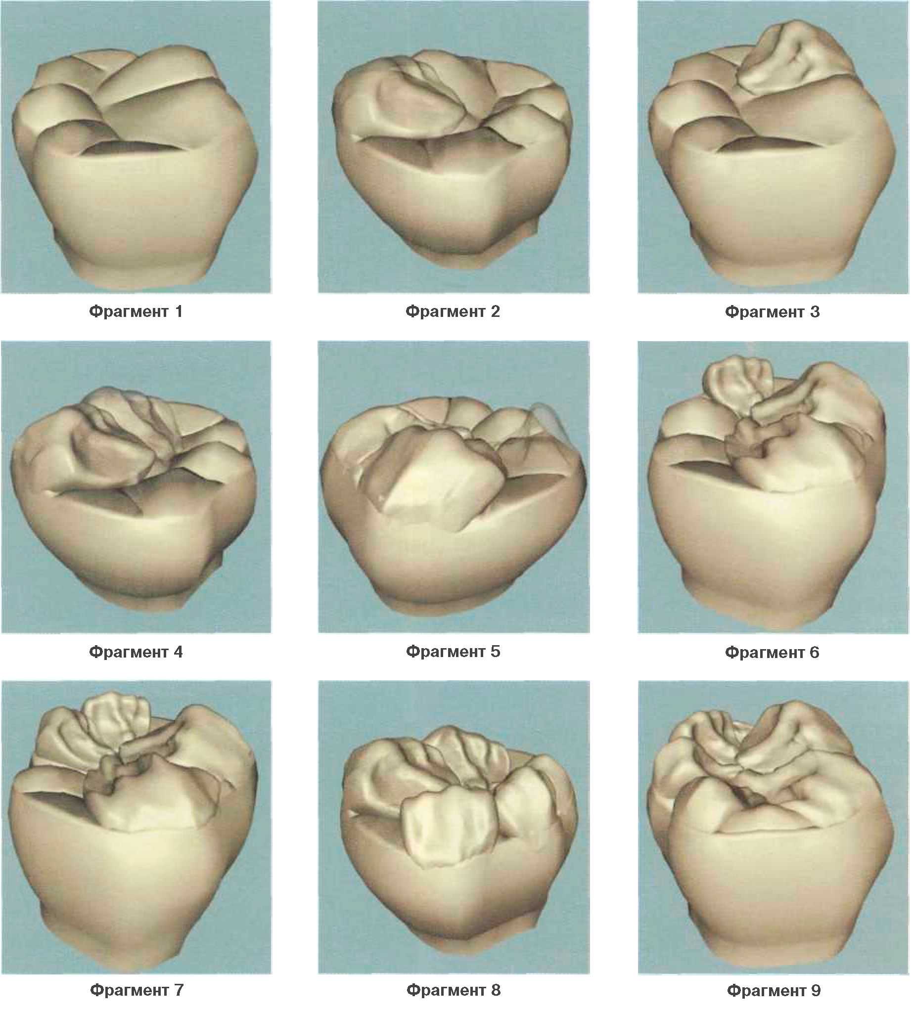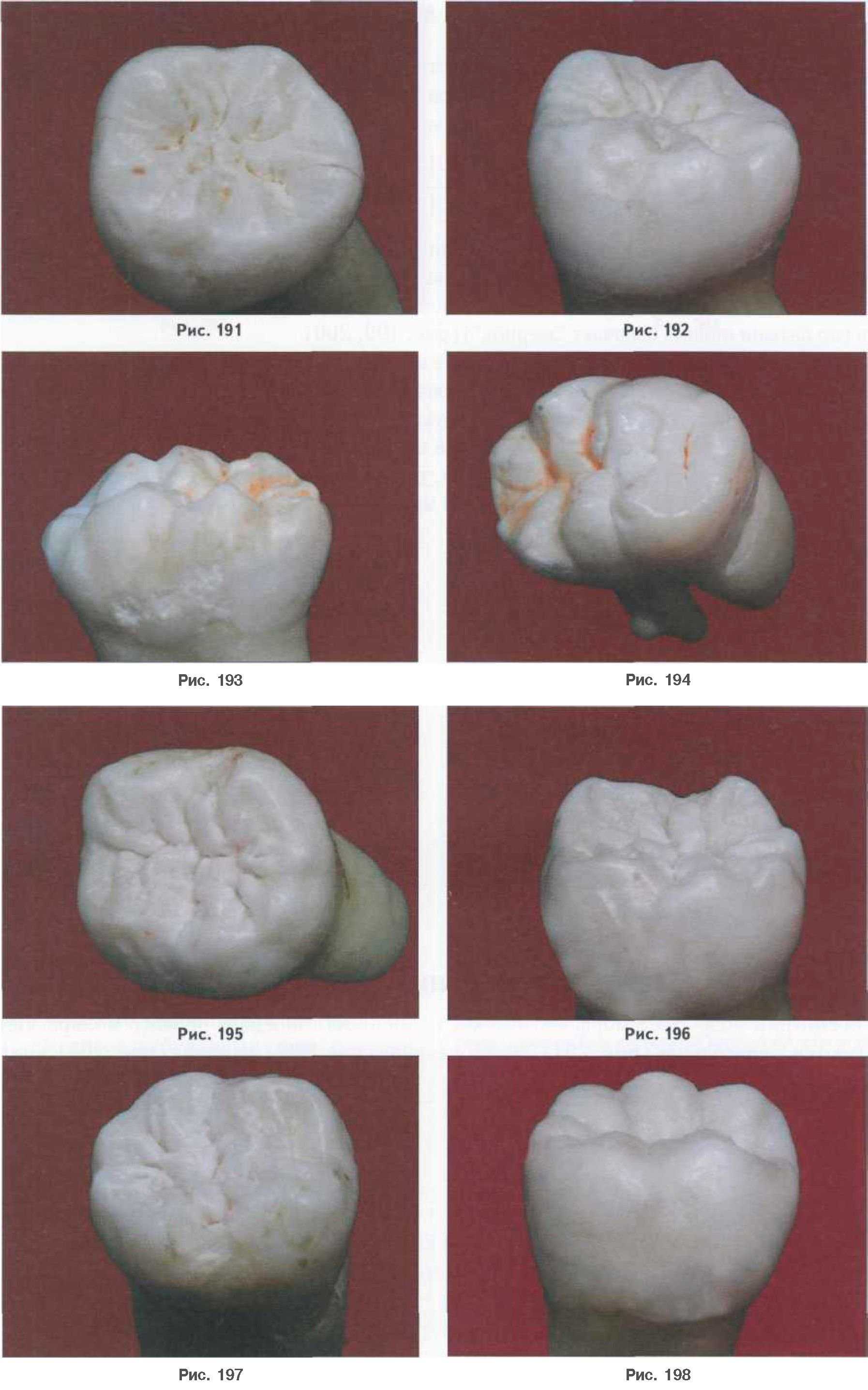 Показана серия снимков зубов человека (рис. 189-198), многообразие природных форм группы моляров, где в различных комбинациях демонстрируется N-количество одонтомеров, которые сочетаются между собой в определенных соотношениях и представляют достаточно интересные варианты коронок зубов. Нам представилось интересным рассмотреть анатомическое строение коронок зубов, учитывая конкресцентную теорию их происхождения.