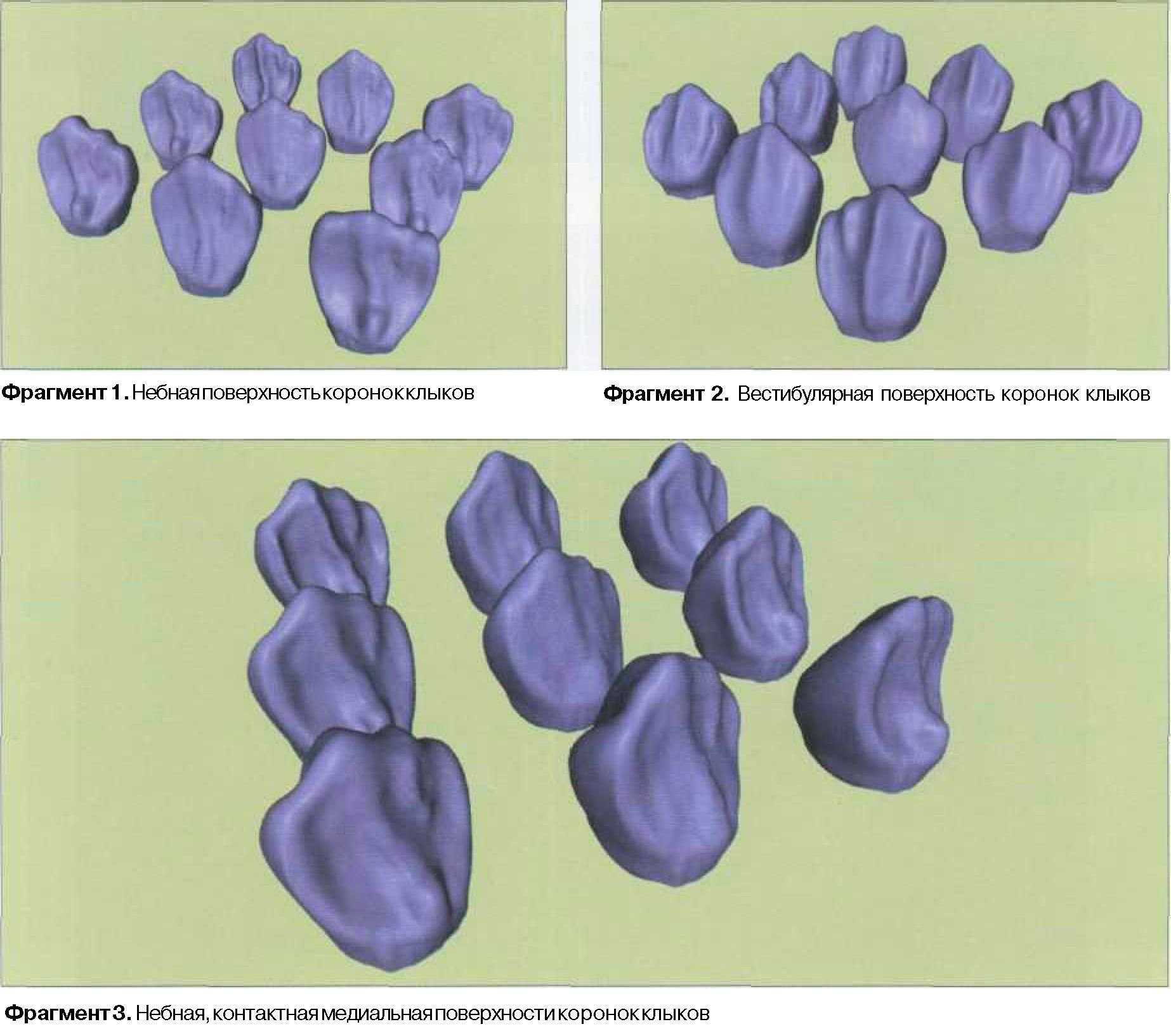 Клыки находятся на грани определенных классов (резцы и премоляры), данное пограничное положение, с одной стороны, объединяет, с другой стороны, разъединяет разные функциональноориентированные группы зубов (рис. 185). Признавая существование данной величины, относительно нее сопоставляют все возможные варианты строения других зубов, где определенным образом сочетаются, находятся в композиции (соединении, связи) отдельные морфологические элементы (одонтомеры). Так, например, при редукции рвущего бугра форма клыка напоминает резец. При "слиянии" одонтомеров образуются многобугорковые зубы. Зная строение одонтомера, можно объяснить макроструктуру многокорневых зубов. Представлены фрагменты анимационного фильма "Вариации моделей верхних клыков", в которых наглядно отображается последовательность моделирования первого моляра нижней челюсти из клыков. Имеющиеся 9 вариантов коронок клыков созданы нами путем компьютерного моделирования в программе 3D Master. Каждая коронка — модель имеет индивидуальную форму и объем, микрорельеф поверхностей. Фрагменты анимационного фильма "Вариации моделей верхних клыков"