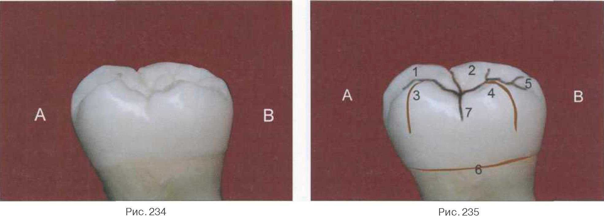 Объединяясь между собой, одонтомеры сходятся, образуя борозду 1 порядка в виде рисунка крестообразной формы, где: 1 — медиовестибулярный или передний щечный бугорок, 2 — дистовестибулярный или задний щечный бугорок, 3 —медиолингвальный или передний язычный бугорок, 4 —дистолингвальный или задний язычный бугорок. Кроме основных бугорков имеется незначительный редуцированный пятый бугорок, дистальный или гипоконулид(5). Каждый из одонтомеров ограничен бороздами. Так, 6 — медиальная борозда, разделяющая передний щечный бугорок от переднего язычного, 7 — дистальная борозда, разделяющая задний щечный от заднего язычного, 8 — дистовестибулярная борозда, разделяющая задний щечный от заднего, 9 — вестибулярная борозда, разделяющая передний щечный бугорок от заднего щечного, 10 — лингвальная борозда, разделяющая передний и задний лингвальные бугорки. Вышеуказанные борозды (6, 7, 9, 10), а также гребни основных бугорков (1, 2, 3, 4) сходятся в центре коронки в достаточно объемном углублении, центральной ямке (11). Контакт между бугорками в области центральной ямки и слагающийся узор борозд весьма разнообразен. Выделяют также переднюю (12) и заднюю (13) триангулярные ямки. Рис. 232, 233 отражают вестибулярную поверхность интактной коронки 47 зуба.