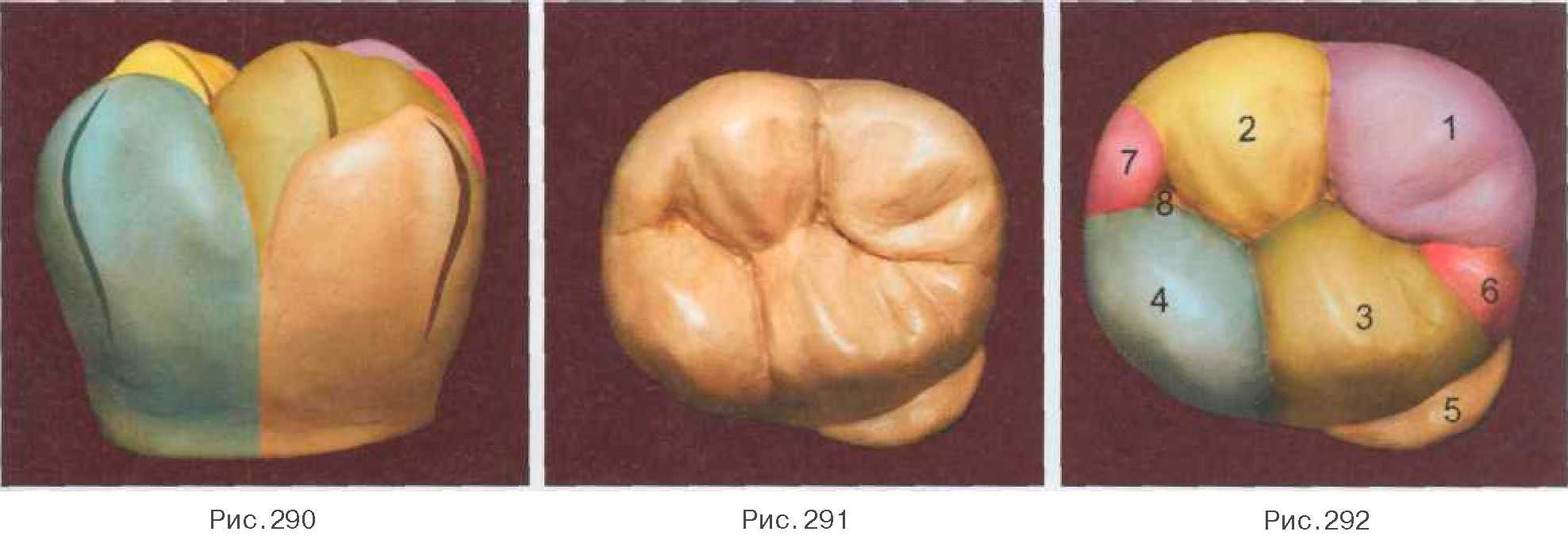 Передний бугор выше. Дистальные режущие края бугорков длиннее медиальных. У каждого из них моделируем незначительно выраженные продольный, медиальный и дистальный валики, отделенные друг от друга соответствующими углублениями. Небная поверхность сужается в пришеечной трети и делится небной бороздой на две части для оформления контуров небных бугорков (рис. 284). На боковой поверхности протоконуса моделируем бугорок Карабелли, представляющий собой самостоятельное образование одонтомер с хорошо выраженной вершиной (рис. 285-287). Рис. 288 отображает медиальную, рис. 289 — дистальную контактные поверхности коронки верхнего правого первого моляра. Зона медиального контактного пункта (1) оформляется на границе верхней и средней трети коронки, зона дистального контактного пункта (2) — в средней трети коронки.