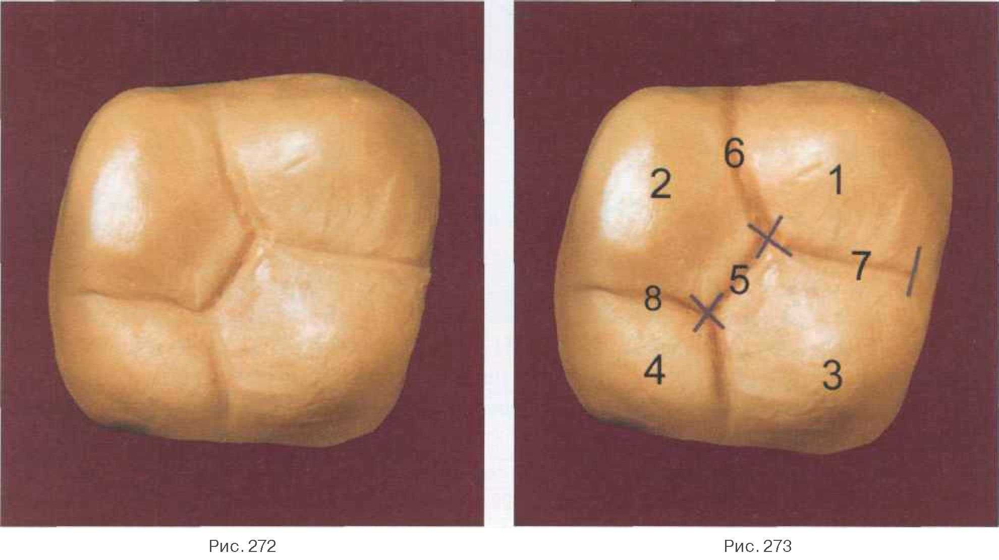 Н-образной бороздой, определяющей положение фиссур, делим поверхность на неравные части для расположения основных морфологических элементов (рис. 273).