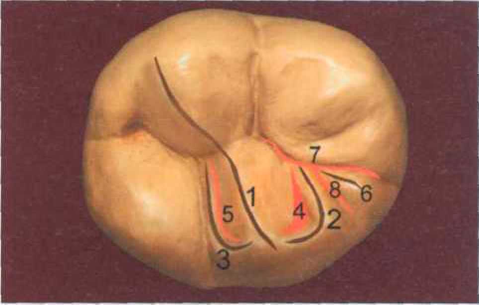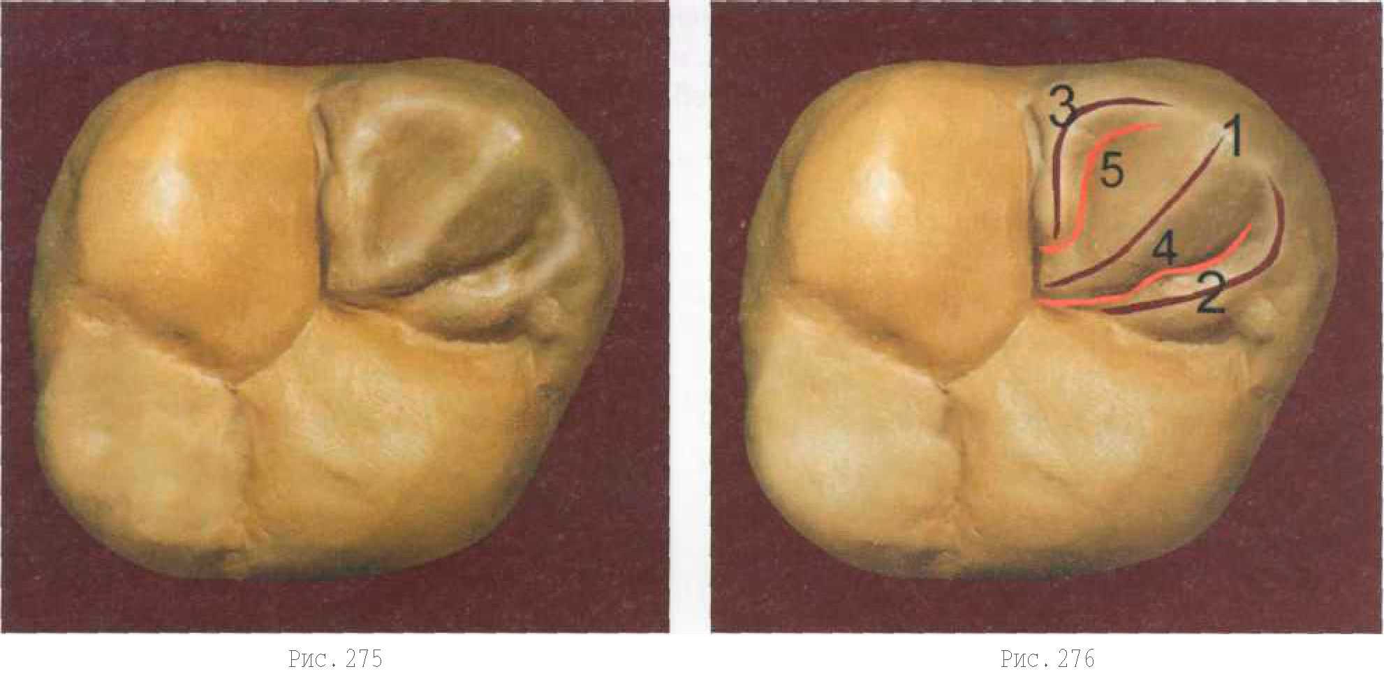 Между собой едва заметным углублением (5). Моделируем элемент медиального краевого гребня, представляющий одонтомер (дополнительный бугорок — 6), соединяющий между собой медиальные небный и щечные бугорки. Моделируем самый низкий дистальный небный бугорок (гипоконус), отделенный от косого гребня глубокой дугообразно изогнутой дистопалатинальной бороздой (1), выходящей на небную поверхность и впадающей в дистальную ямку (2) (рис. 280, 281). Его вершину располагаем на небной половине жевательной поверхности, структура бугорка недифференцированна.