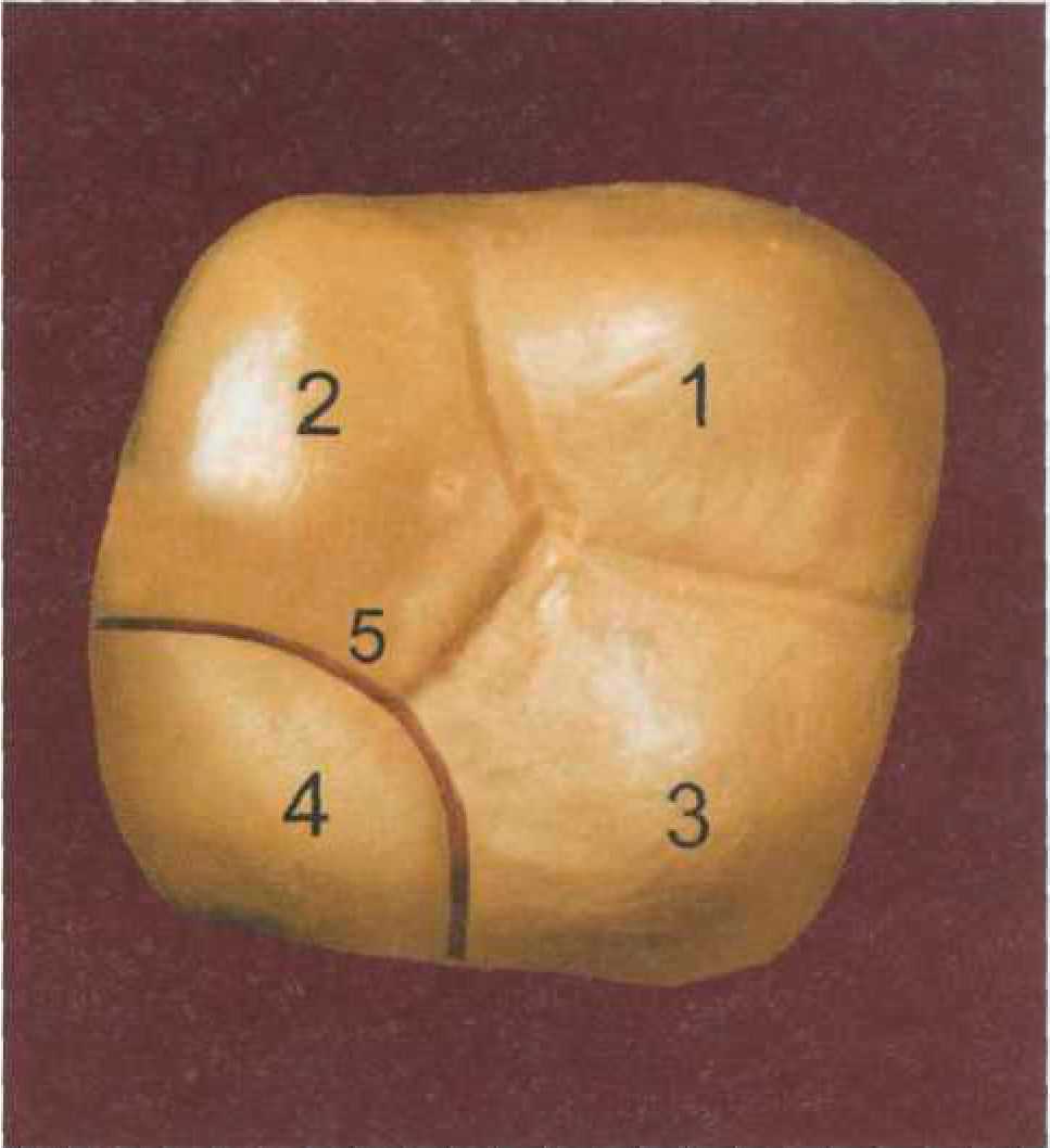 Медиальные щечный (1) и небный (3) бугорки вместе с дистальным щечным (2) образуют треугольник (тригон), а задний небный (4) — талон (пятка) отделяется от них глубокой дистопалатинальной бороздой (5), переходящей на небную и дистальную контактную поверхности (рис. 274). Наиболее крупным по занимаемой площади будет медиальный небный бугорок (протоконус), меньшую площадь отведем медиальному щечному (параконусу), который будет превосходить предыдущий по высоте. Дистальный небный бугорок (гипоконус) продолговатой формы, он превосходит по размерам дистальный щечный (метаконус) и представляет собой оформленный дисто-небный угол коронки, вследствие чего коронка приобретает ромбическую форму. Начинаем моделирование медиального щечного бугорка (параконуса), он будет выдвинут медио-вестибулярно относительно медиального небного и отделен от него глубокой медиальной фиссурой (рис. 275, 276). Валики этого бугорка достаточно хорошо выражены. Самым широким является продольный валик; его гребень (1) выкладываем в медио-дистальном направлении, к центру жевательной поверхности, до центральной фиссуры. Медиальный валик (2) выкладываем от