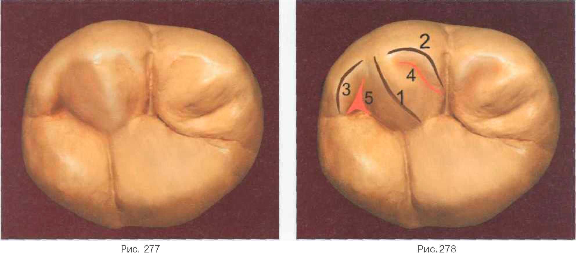вершины бугорка: вначале вдоль медиального края, затем изгибаем к центру. Образовавшееся в результате моделирования медиальное углубление (4) достаточно глубокое. Дистальный валик (3) моделируем таким образом, что его форма напоминает треугольник, отделенный от основного валика характерным углублением (5), направленным в вестибулярную борозду. Далее в зеркальном отражении моделируем основные морфологические элементы дистального щечного бугорка (метаконуса) (рис. 277, 278).