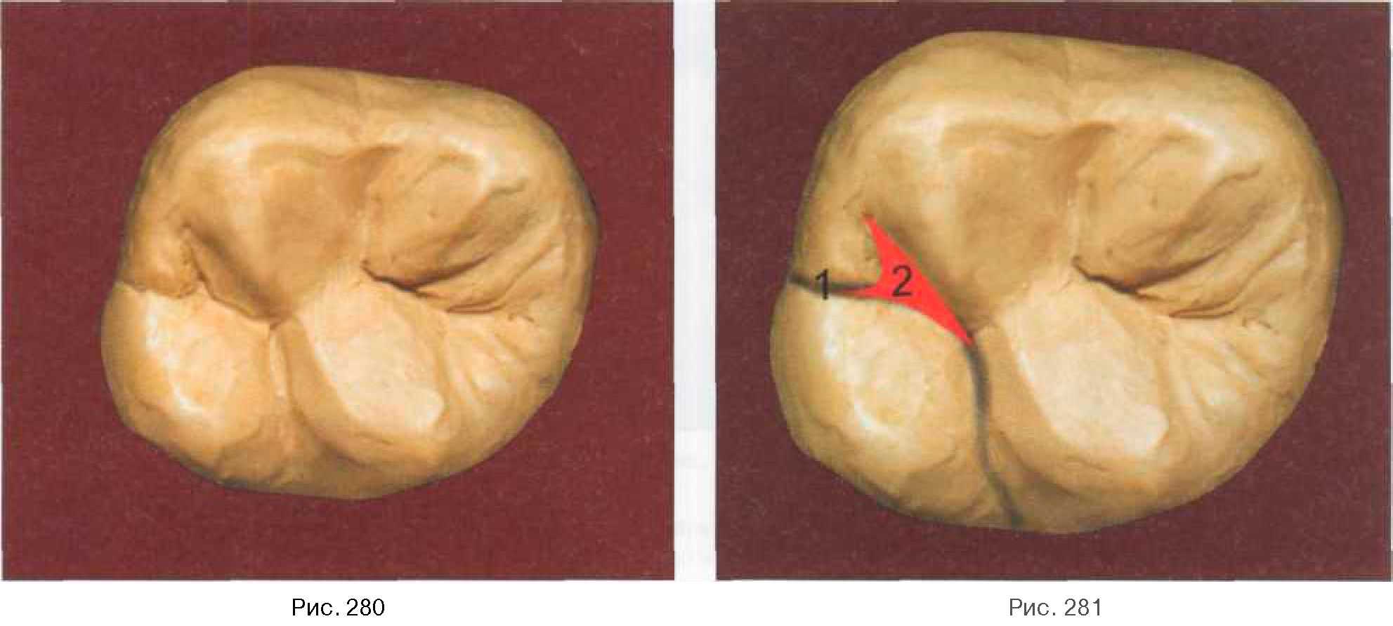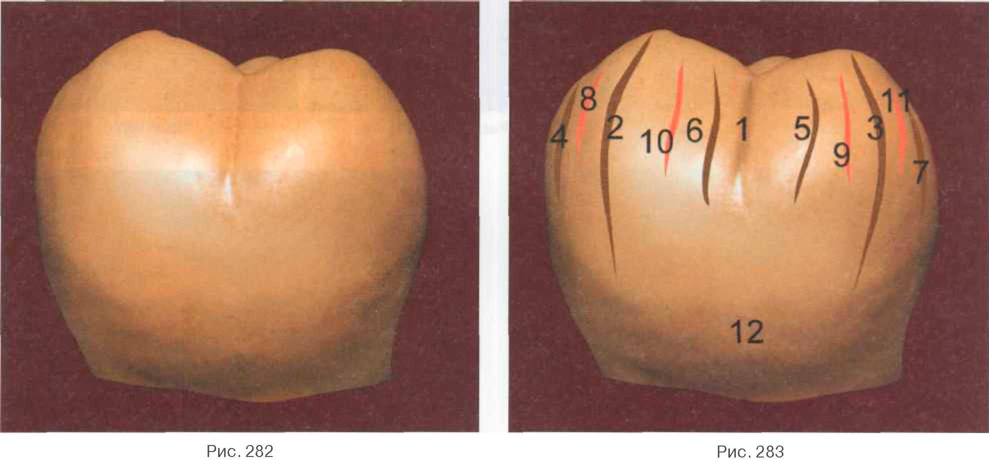 Приступаем к формированию щечной поверхности первого верхнего моляра (рис. 282, 283). В пришеечной трети отмечается выраженное сужение коронки. Вестибулярной бороздой (1), доходящей до средней трети, делим поверхность на две части для оформления контуров щечных бугров, имеющих на режущем крае треугольную форму.