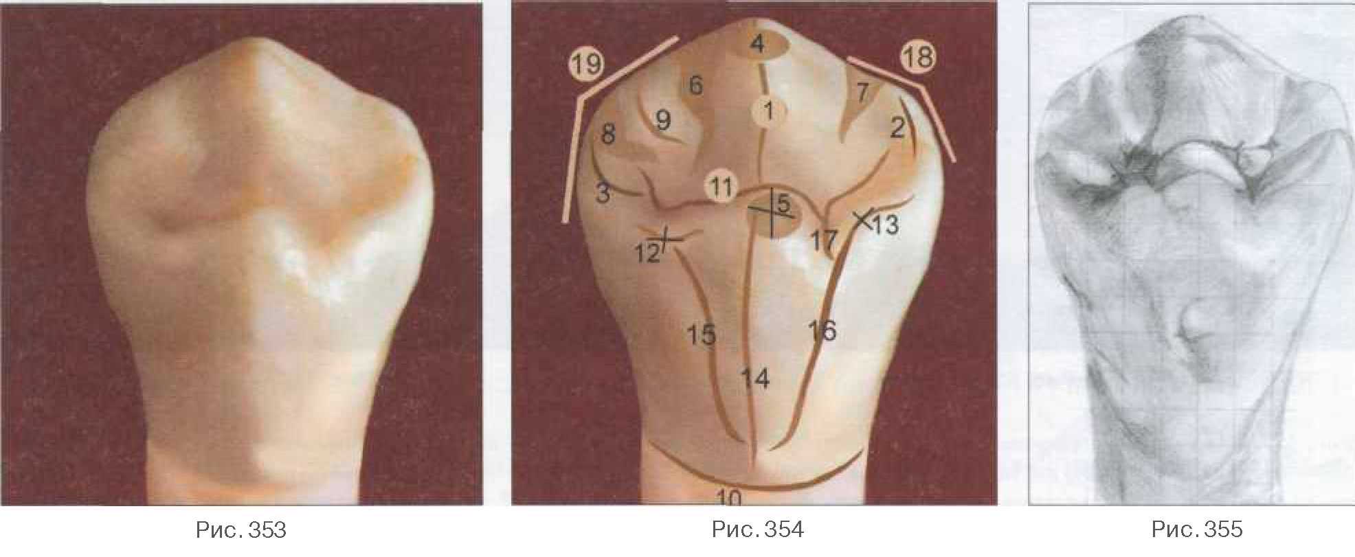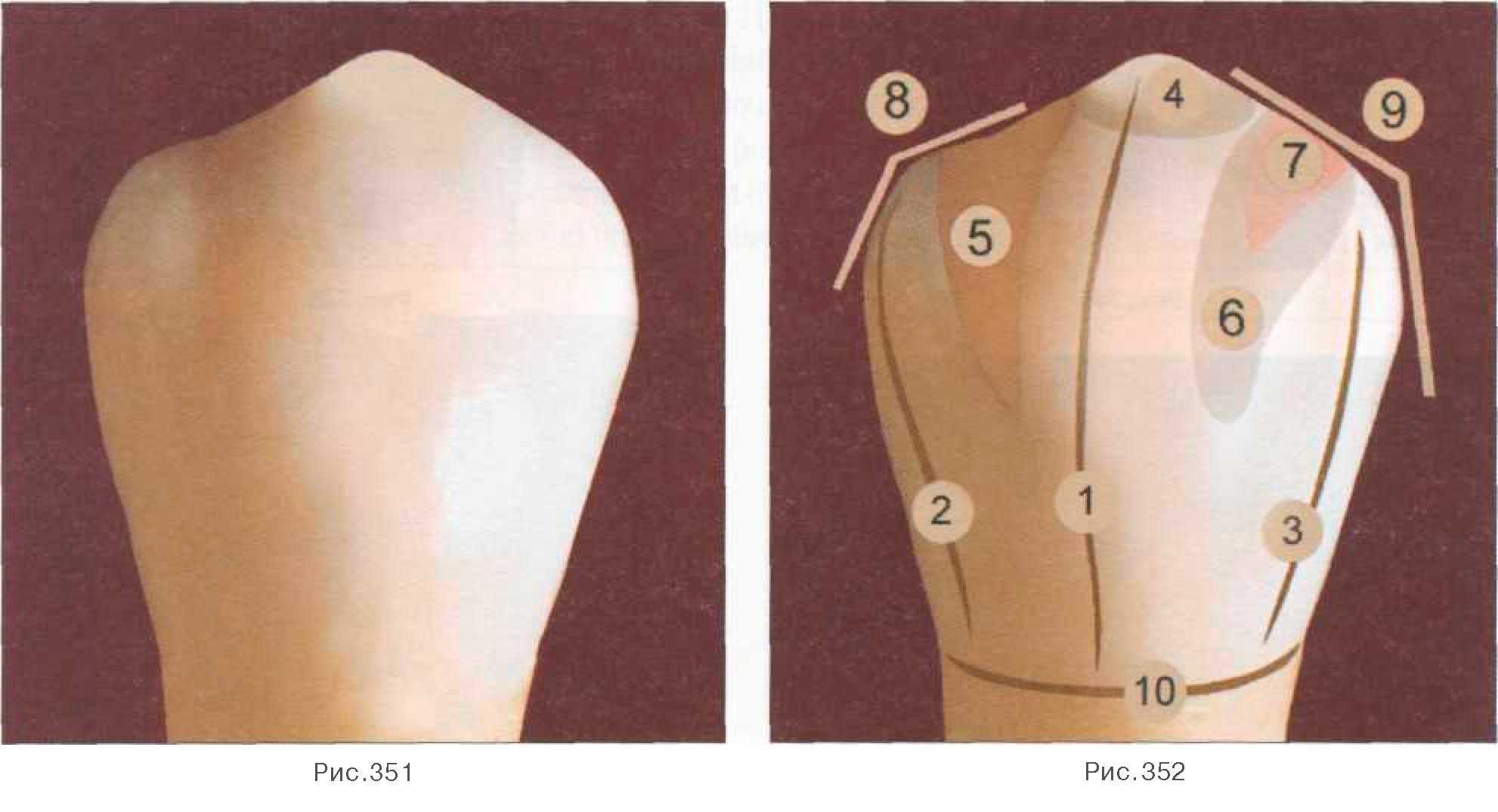 | Первый премоляр НИЖНЕЙ ЧЕЛЮСТИ Демонстрируется вестибулярная поверхность нижнего первого левого премоляра (рис. 351). Основные морфологические элементы выделены и отмечены путем тонирования и нумерации зон (рис. 352).
