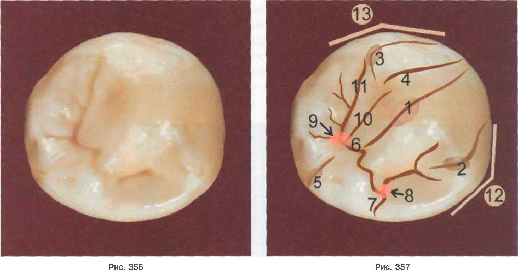 Модуль — одонтомер, составляющий язычную поверхность, имеет также продольный гребень (14), имеющий дугообразный медиальный изгиб, заканчивающийся лингвальным бугорком (5). Отмечается наличие медиального валика (16) с пологими скатами, слабовыраженным гребнем, заканчивающийся медиальным бугорком (13). Дистальныи валик (15) выражен также незначительно, имеет S-образный изгиб, заканчивается дистальным бугорком (12). Продольный и краевые валики разделены между собой сглаженными углублениями. В целом язычная поверхность имеет выпуклые очертания, равномерно сужается в пришеечной области. Со стороны язычной поверхности хорошо видна разница между двумя модулями — одонтомерами вестибулярным, высоко расположенным и значительно меньшим язычным. В области вестибулярного одонтомера отчетливо прослеживаются продольный валик (1) с рвущим бугром (4), краевые валики (медиальный — (2), дистальныи — (3)), дополнительный дистальныи валик (9), углубления (6, 7, 8). Вестибулярный и язычный одонтомеры отделены друг от друга неглубокой центральной фиссурой (11), соединяющей углубления жевательной поверхности. Форма, глубина, протяженность борозд зависит от степени дифференциации поверхностей. Отмечается также наличие коронарно-радикулярной борозды (17), выходящей из медиального углубления на язычную поверхность. Морфология жевательной поверхности нижнего левого первого премоляра представлена на рис. 356, 357.
