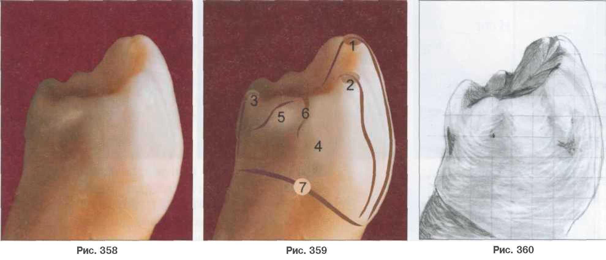 Рис. 358-360 демонстрируют контактную медиальную поверхность (4) нижнего левого первого премоляра. Контур вестибулярной поверхности имеет резкий наклон в язычную сторону. Контур лингвальной поверхности слегка выпуклый. Отчетливо прослеживается разница положения двух одонтомеров, язычный при этом располагается в средней трети высоты коронки. Просматриваются достаточно выраженные гребни продольного (1) и медиального (2) валиков. Рвущий бугор проецируется в центр коронки зуба. |