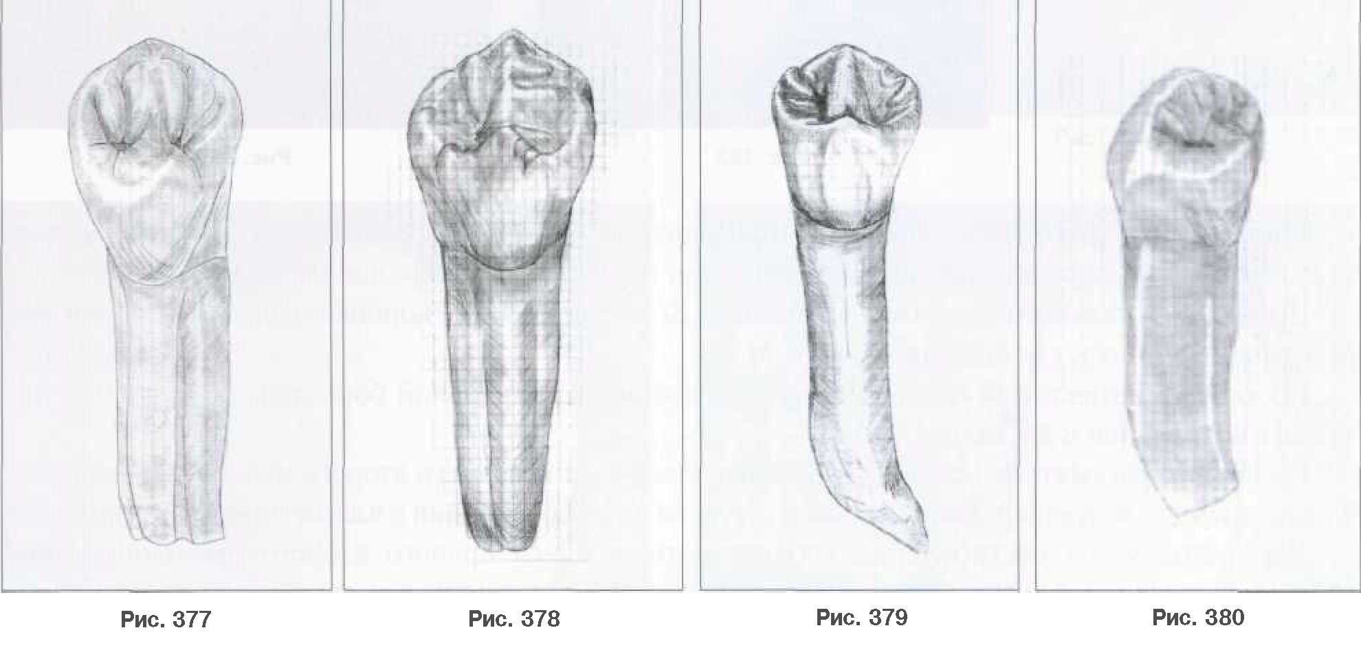 Вторые премоляры, являясь вариабельными зубами внутри своего класса, в большей степени подвергаются редукции-дифференциации. Их близость к группе моляров существенным образом меняет габаритные очертания, конфигурации, микрорельеф поверхностей коронок. Функциональная ценность премоляров в большей степени заключается в перетирании ими пищевого комка и признаки моляризации прослеживаются четче, чем у ключевых зубов данного класса — первых премоляров. Однако влияние морфо-генетического поля со стороны клыков остается достаточным, что характеризуется общностью строения коронок, наличием одонтомеров — модулей, составляющих единый конгломерат — коронку зуба. Рис. 377-380 демонстрируют различные варианты строения коронковой части вторых премоляров с язычной стороны.