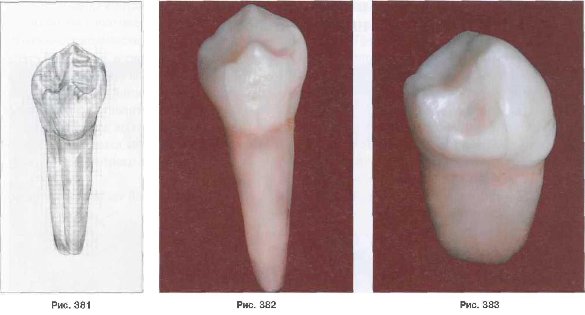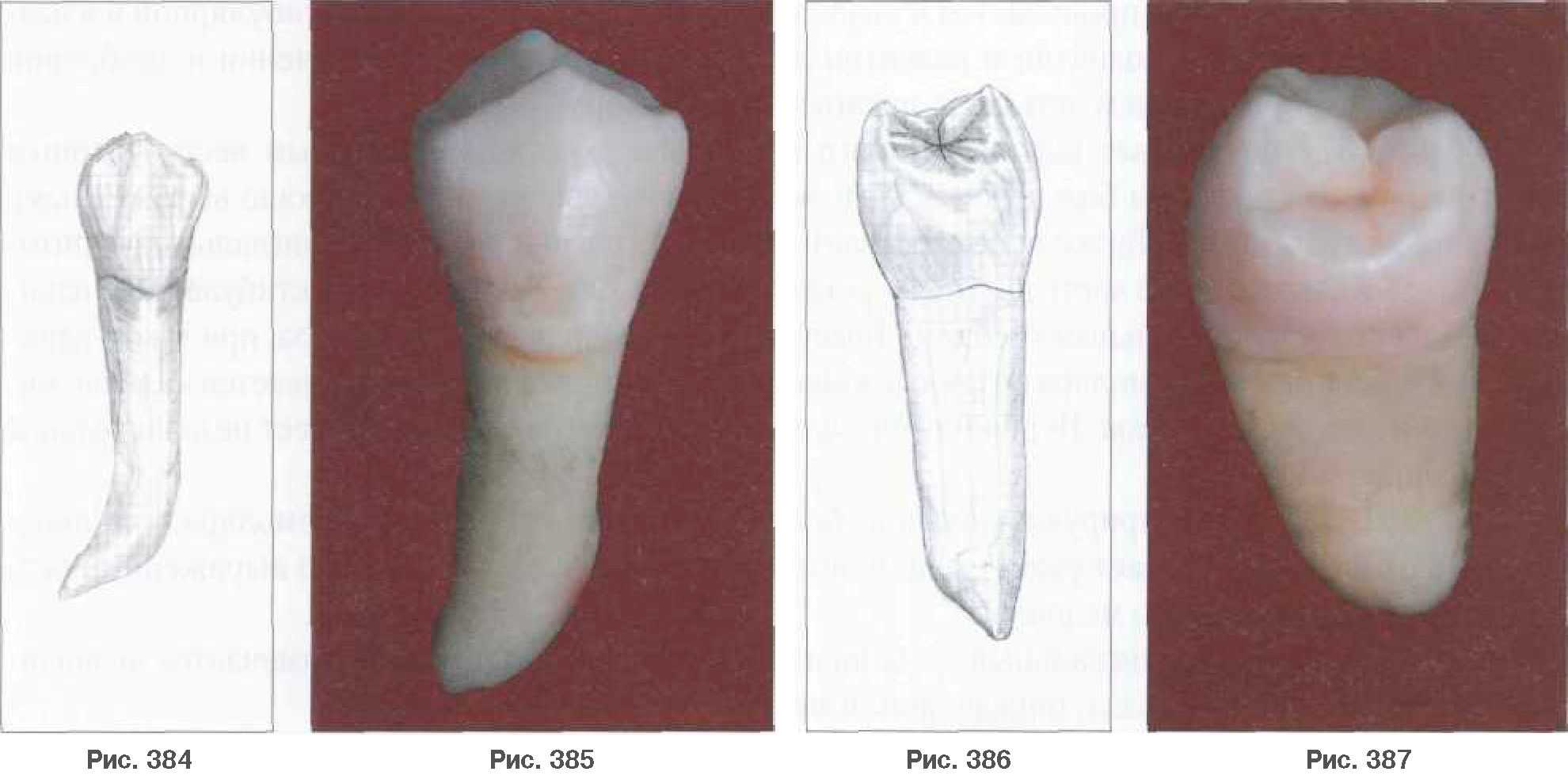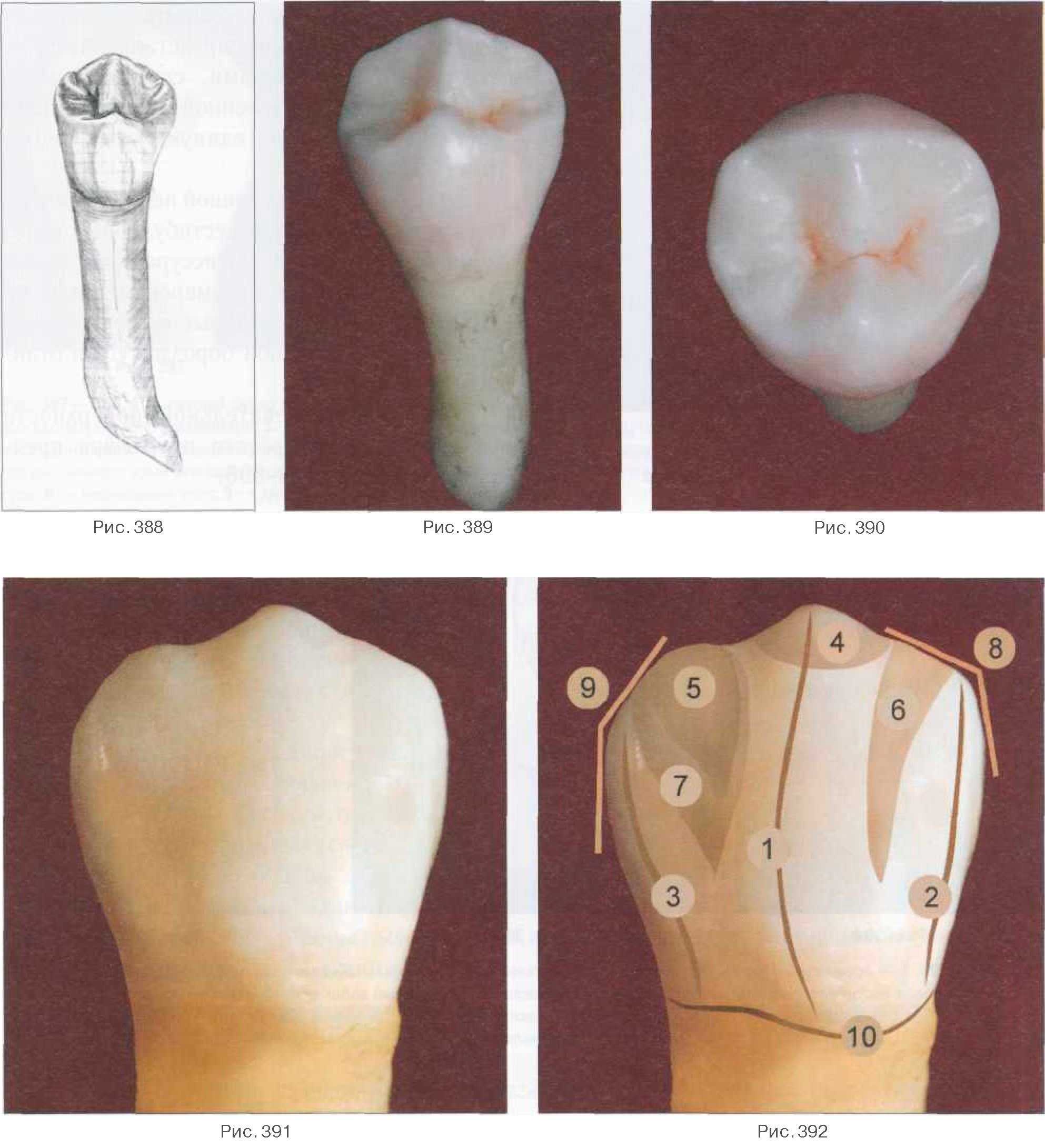 Так рис. 377 показывает коронку второго премоляра, с четко выраженным вестибулярным одонтомером, занимающим большую площадь жевательной поверхности, с хорошо выраженными гребнями, углублениями. Также просматривается незначительной величины лингвальный одонтомер, который занимает 1/3 часть высоты коронковой части зуба и соединен с вестибулярным одонтомером вестибулолингвальным гребнем. Фиссура, разделяющая два одонтомера, при таком варианте строения второго премоляра не прослеживается, хотя отчетливо просматривается наличие медиальной и латеральной ямок. Вершина лингвального одонтомера сглажена, имеет незначительное возвышение. Рис. 381-383 демонстрируют строение более дифференцированного премоляра, где лингвальный одонтомер занимает уже 1/2 часть высоты коронки зуба, имеет четко выраженную острую верхушку, смещенную медиально. Сохранен вестибулолингвальный гребень на жевательной поверхности, намечается незначительная центральная борозда, определяются медиальная и лингвальная ямки.