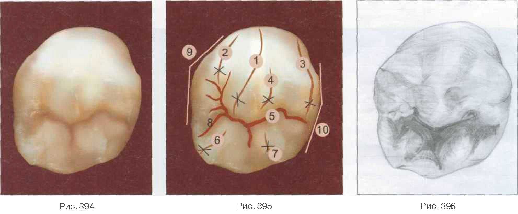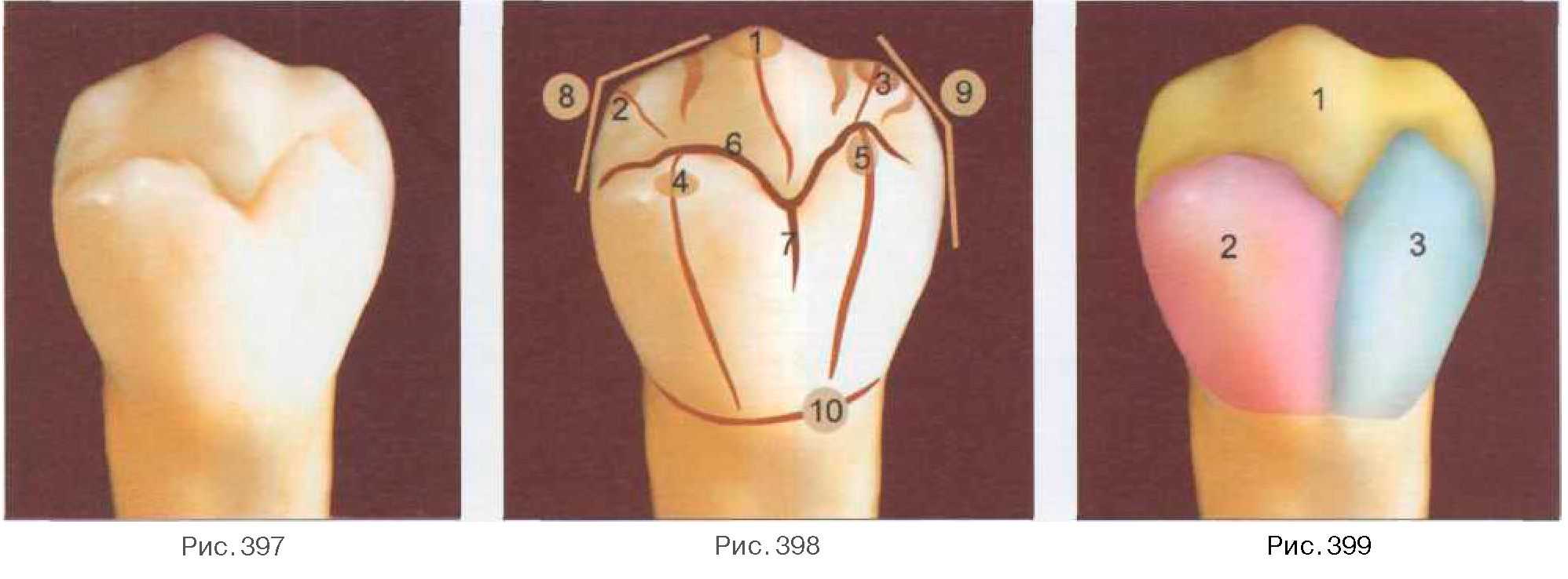В области вестибулярного одонтомера прослеживается хорошо выраженный гребень продольного валика (1), продолжающийся в язычной части жевательной поверхности лингвальной бороздой (рис. 395). Медиальный (2) и дистальный (3) валики, окаймляют вестибулярную часть жевательной поверхности с боковых сторон. Заметен узкий гребень дополнительного валика в дистальном углублении (4), продолжающийся до центральной фиссуры. Медиальный язычный одонтомер объемнее дистального, от вестибулярного отделен коронаро-радикулярной бороздой (8). Гребень продольного валика направлен к центральной фиссуре. В наименьшем из одонтомеров (дистальном) также можно выделить верхушку, продольный, медиальный, дистальный валики, углубления, направленные к центральной фиссуре. Рис. 397, 398, отображают морфологические особенности нижнего второго правого премоляра с язычной стороны. Со стороны язычной поверхности также хорошо просматриваются три одонтомера (рис. 399): 1 — вестибулярный; 2 — медиальный язычный; 3 — дистальный язычный.