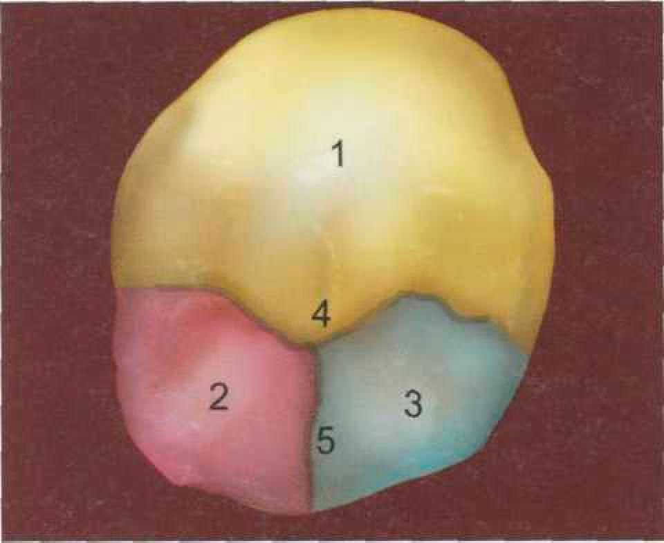 Язычные одонтомеры занимают 2/3 высоты коронки зуба. Каждый из одонтомеров имеет четко выраженные основные и дополнительные морфологические элементы, что придает поверхностям коронки высокую степень дифференцированное™. Благодаря хорошо развитому микрорельефу увеличивается площадь соприкосновения поверхностей коронки с пищевым комком, а процесс перетирания происходит более эффективней и быстрее. Рис. 400, 401 отображают морфологические особенности второго премоляра с контактной дистальной поверхности. Отмечается наклон коронки зуба в оральную сторону, а также резкая выпуклость вестибулярного контура в цервикальной трети. Контур лингвальной поверхности умеренно выпуклый, наибольшый участок выпуклости наблюдается в средней трети коронки. Отчетливо прослеживается разница в высоте вестибулярного и язычных одонтомеров, где язычные занимают 2/3 высоты коронки зуба. В области вестибулярного одонтомера просматриваются продольный валик (1), дистальный валик (2), дополнительный дистальный валик (3). С лингвальной стороны выделяются основные продольные валики медиального (4) и дистального (5) язычных одонтомеров.