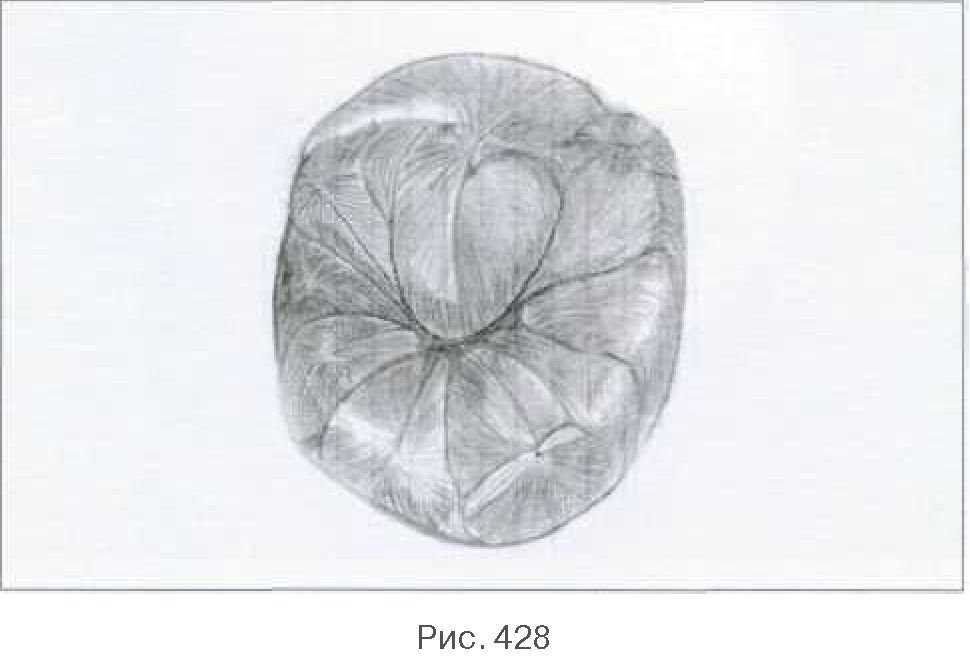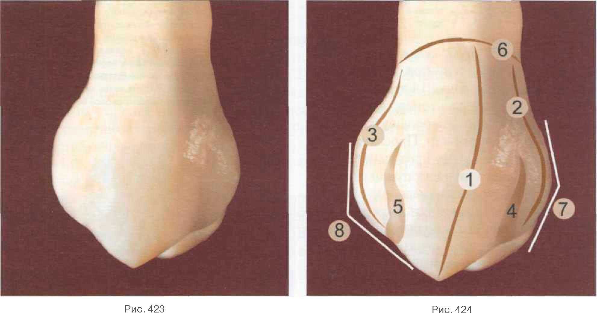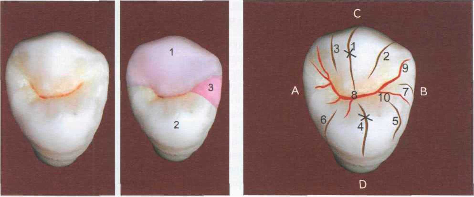Аналогично клыку — одонтомеру на вестибулярной поверхности премоляра просматривается продольный валик (1), имеющий дугообразный медиальный изгиб и заканчивающийся рвущим бугром, также хорошо прослеживаются медиальный (2) и дистальный (3) валики. В данном варианте строения боковые валики имеют S-образный изгиб, выраженый в большей степени в окклюзионной и средней трети коронки. Определяются соответствующие медиальное (4) и дистальное (5) углубления. На некоторых премолярах встречается дополнительный дистальный валик в окклюзионной трети. Со стороны жевательной поверхности верхнего правого первого премоляра просматриваются 3 одонтомера: вестибулярный (1) и небный (2) и дополнительный медиальный (3) (рис. 425-427). Рис. 427, 428 отображают ход основных морфологических элементов на жевательной поверхности коронки 14 зуба. Вестибулярный одонтомер, являясь более крупным, занимает большую площадь жевательной поверхности. Прослеживается рвущий бугор основного продольного валика (1), имеющего вид достаточно широкой складки с медиальным изгибом. Гребень продольного валика достигает средней части межбугорковой фиссуры. Выделяются достаточно отчетливо боковые валики: медиальный — 2; дистальный — 3, отделенные от продольного незначительными углублениями. Небный одонтомер занимает меньшую площадь жевательной поверхности. Продольный валик (4) небного одонтомера имеет хорошо выраженный рвущий бугор, расположенный медиально, что является определяющим признаком стороны зуба. Гребень и скаты продольного валика полого спускаются к центру межбугорковой фиссуры. Также отмечается наличие боковых валиков (медиальный — (5), дистальный — (6)) однако выражены они незначительно, отделены от продольного валика слегка заметными углублениями. Между одонтомерами пролегает отчетливо выраженная межбугорковая борозда (8), достаточно прямолинейная, ограниченная с двух сторон краевыми гребнями. В данном варианте в медиальном отделе борозда (10) разрезает краевой гребень и выходит на боковую поверхность коронки. Другая веточка межбугорковой борозды (9) идет на вестибулярную поверхность. Между вестибулярной ветвью и продолжающейся в медиальном направлении основным стволом борозды располагается дополнителный медиальный бугорок (7). Небная поверхность верхнего правого премоляра является гладкой, равномерно выпуклой, чаще всего отсутствуют гребни, валики, фиссуры (рис. 429-431).