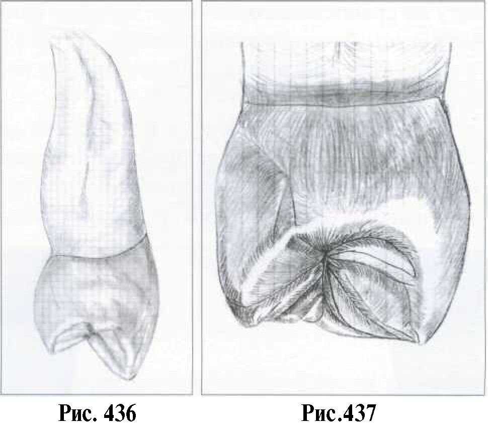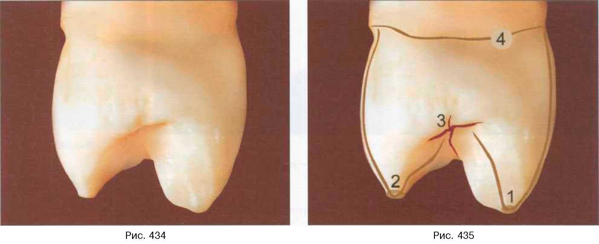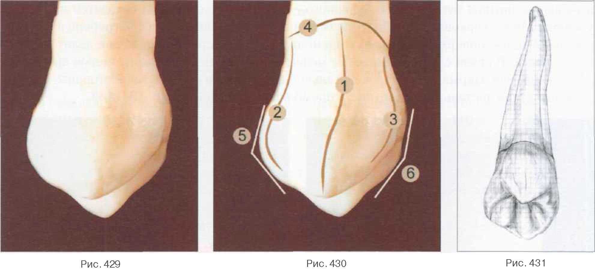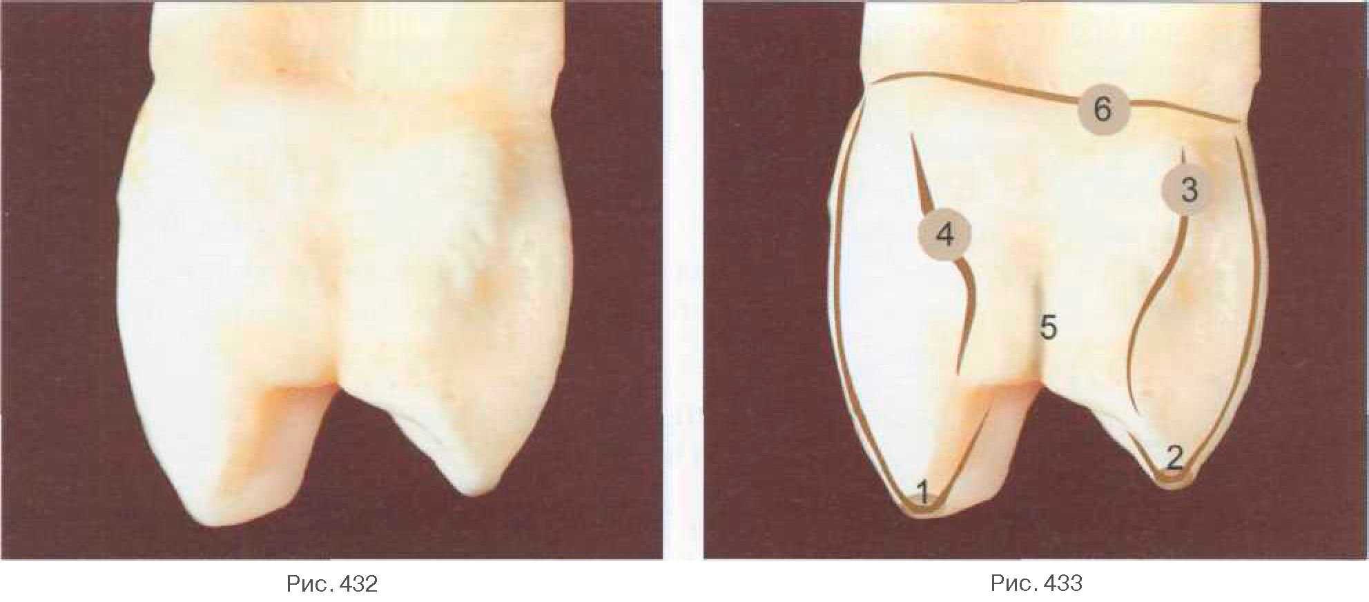 Тем не менее хорошо просматривается рвущий бугор небного одонтомера, смещенный медиально, при этом дистальное ребро режущего края длиннее медиального. Боковые валики (медиальный — (2), дистальный — (3)) имеют выраженный S-образный изгиб по вертикальной плоскости, что придает боковым поверхностям выпуклость и равномерное схождение их в пришеечной области. Чаще всего небный одонтомер занимает меньшую высоту по сравнению со щечным, поэтому с небной поверхности просматривается дистальная часть вестибулярного одонтомера. Рис. 432, 433 демонстрируют коронку верхнего правого первого премоляра с контактной медиальной поверхности. Отмечается равномерная выпуклость вестибулярного и небного контуров коронки по всей длине, каждая из двух поверхностей наклонена к противоположному бугорку, что напоминает нераспустившийся цветочный бутон. Выявляется соотношение высоты вестибулярного и небного одонтомеров, в данном случае вестибулярный одонтомер превышает небный, а вершины рвущих бугров (вестибулярного — (1), небного — (2)) находятся на разных уровнях. Межбугорковая борозда (5), разделившая медиальный краевой гребень и выходящая на боковую поверхность коронки премоляра, хорошо прослеживается и делит коронку на две части. В связи с тем, что краевые медиальные гребни обоих одонтомеров выражены достаточно, они закрывают обзор жевательной поверхности с медиальной стороны.