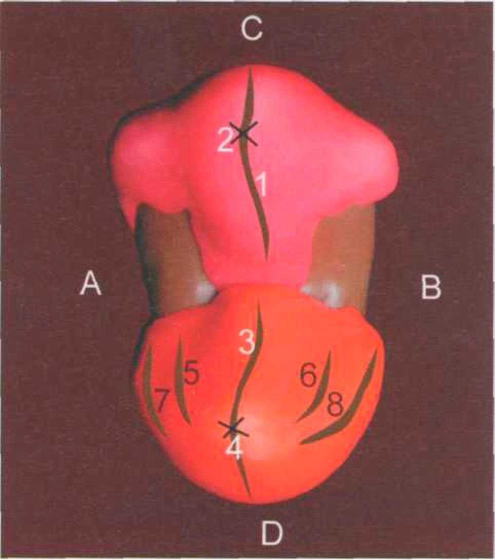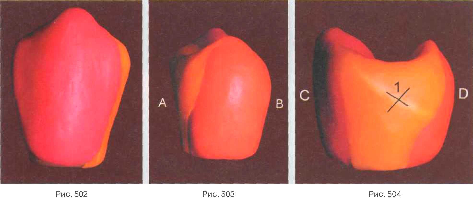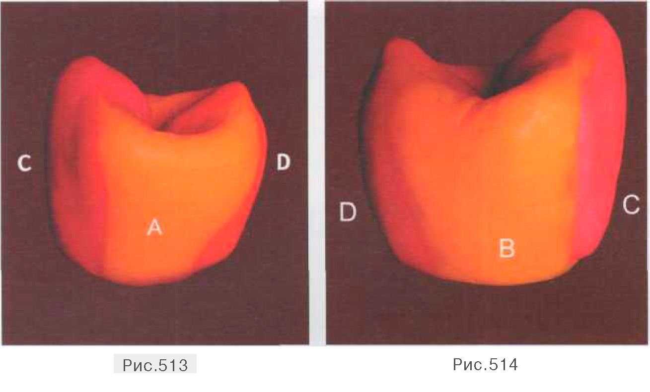А — медиальная сторона; В — дистальная сторона; С — вестибулярная сторона; D — небная сторона; 1 — вестибулярный одонтомер; 2 — небный одонтомер; 3 — краевой медиальный валик; 4 — медиальный валик вестибулярного одонтомера; 5 — медиальный валик небного одонтомера; 6 — межбугорковая фиссура После моделирования основных одонтомеров (вестибулярного — (1), небного — (2)) приступаем к заполнению медиальной части коронки. На жевательной поверхности выкладываем краевой медиальный валик (3), который объединяет между собой два одонтомера, соединяя медиальные вершины вестибулярной и небной поверхностей. Краевой валик имеет хорошо выраженный гребень, своеобразный ход которого дает определенные очертания медиальной контактной поверхности. Далее заполняем свободное пространство между продольными валиками обоих одонтомеров и медиальным краевым гребнем, доформировывая медиальный валик (4) вестибулярной части и медиальный валик (5) небной части, стремящиеся к межбугорковой фиссуре (6). Более четче прокладываем основную центральную борозду, а также мелкие фиссуры, дифференцирующие жевательную поверхность. Не ограничиваясь формированием только жевательной поверхности, моделируем также медиальную контактную поверхность, захватывая при этом медиальные части щечной и небной поверхностей (рис. 502-504).