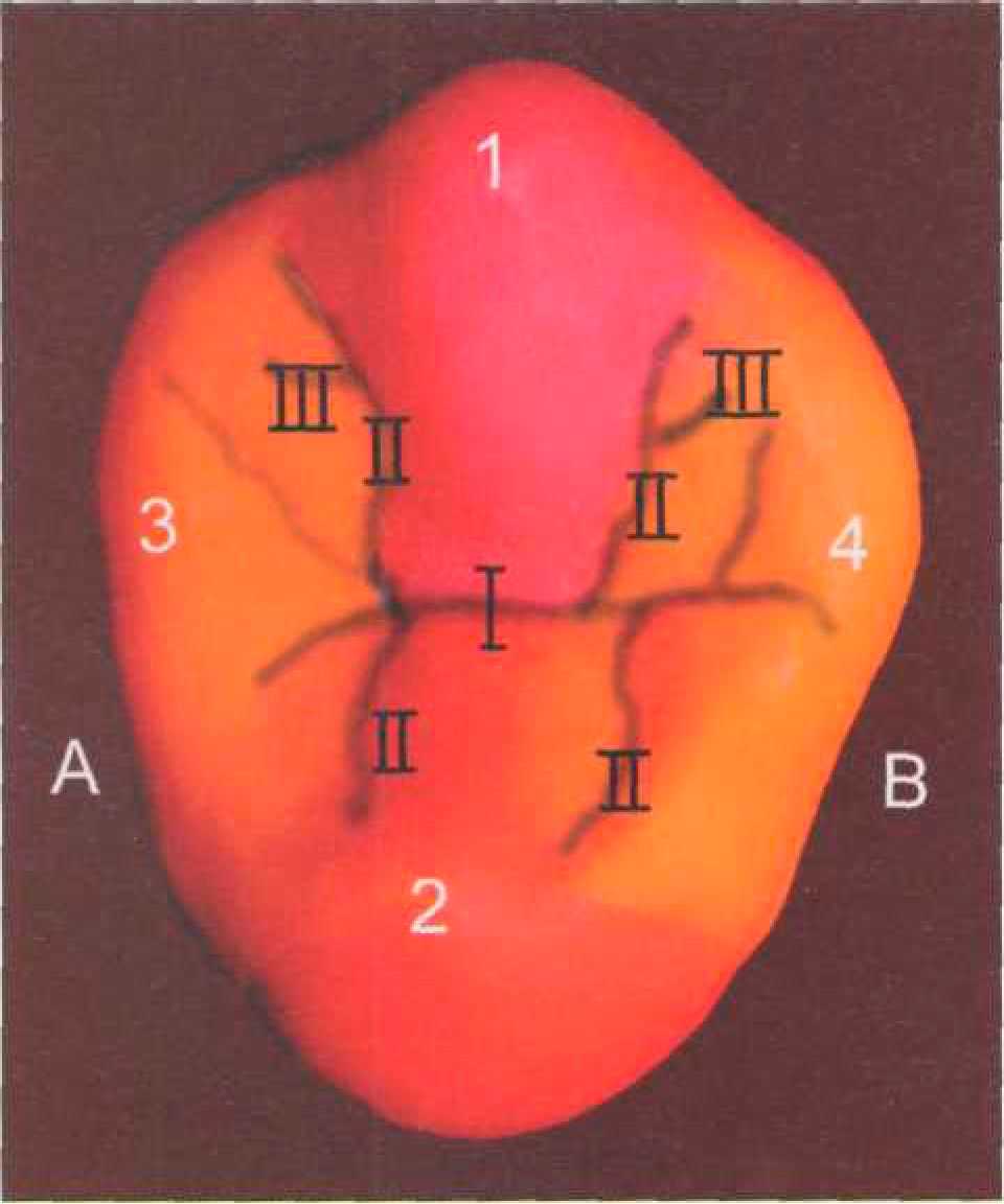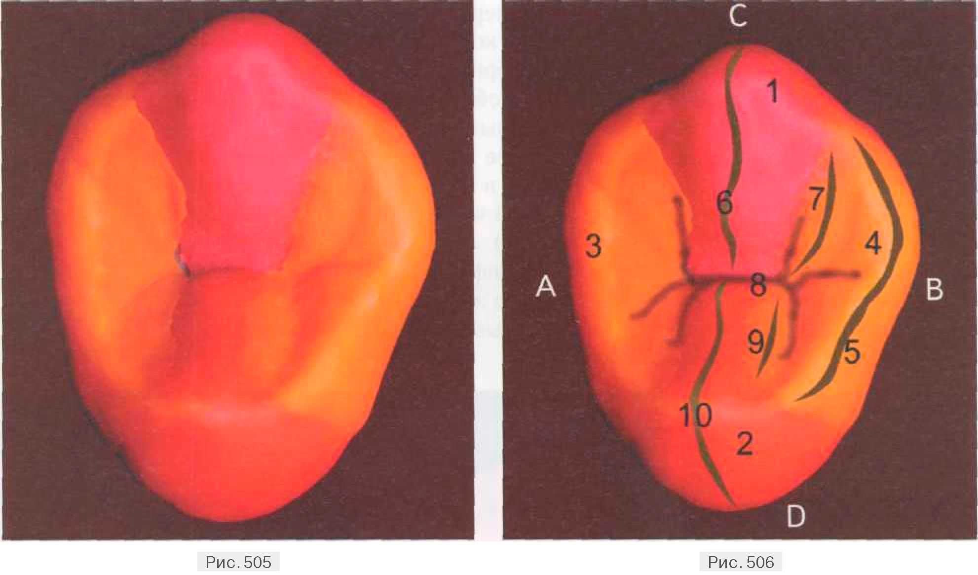 поверхности, стремящийся к межбугорковой фиссуре (8). В области небного одонтомера также формируется дистальный валик (9), но очертания его более сглажены. По всей жевательной поверхности прослеживается дифференцированная сеть фиссур, каждая из которых имеет свое предназначение (рис. 507). Фиссурой I порядка является межбугорковая борозда, отделяющая друг от друга вестибулярный (1) и небный (2) одонтомеры. В области дистального краевого гребня межбугорковая борозда его рассекает, выходя на контактную дистальную поверхность коронки. В фиссуру I порядка впадают несколько фиссур II порядка, которые разграничивают основные морфологические элементы между собой. Более тонкую дифференциацию поверхностей делают мелкие борозды III порядка, впадающие в борозды ІІ порядка. За счет множественного деления окклюзионной части коронки зуба сетью моделирюеться дифференцированная жевательная поверхность, при этом значительно увеличивается ее рабочая площадь, что имеет важное функциональное значение в процессе переработки пищи.